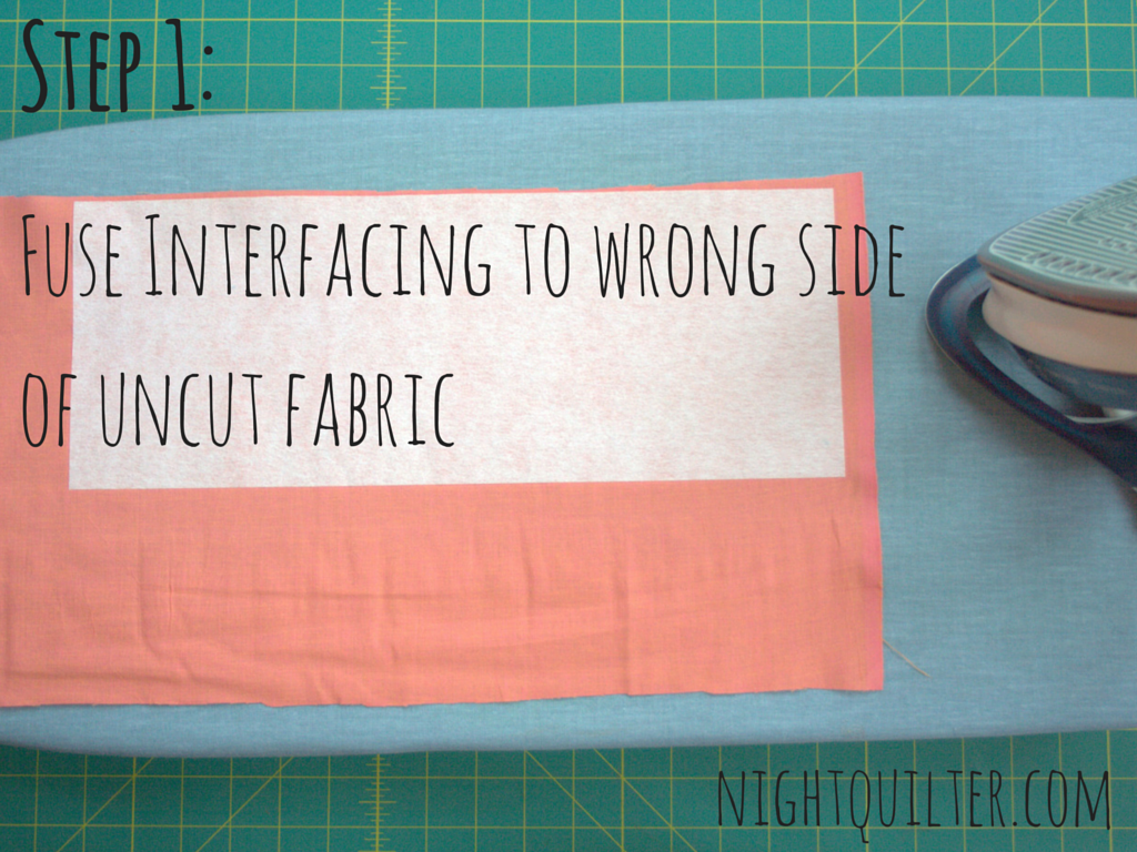 Thread Catch Base & Hanging Tab Step 1Cut the 14.5″x5.5″ piece of stiff fusible interfacing (Pellon 808). Following the instructions on the interfacing, fuse to wrong side of coordinating fabric (fabric is uncut at this point).