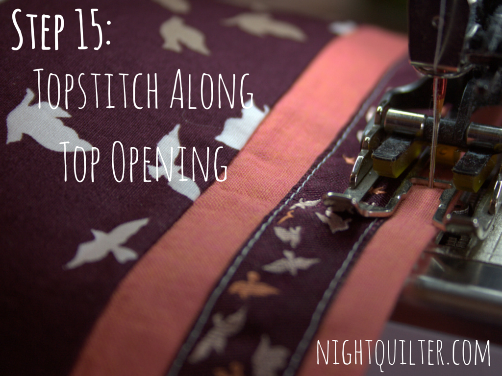 Thread Catch Step 15Next, top stitch along the entire top of the thread catch opening using a scant 1/4″ seam. Once the hanging tab was securely sewn in, I backstitched and cut my thread, again flipping the thread catch the other way (outside of the thread catch facing up) so that I could ensure that my top stitches are even since they are the ones that show.
