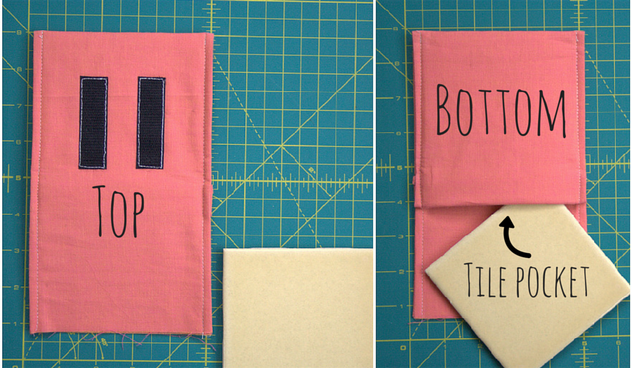 tile pocket imageYou have just created a tile pocket. I have seen some thread catches weighted with completely sewn-in tiles, but decided to design this with an opening where the tile can be inserted or removed as needed. This means that you can use anything you want to weigh down your thread catch, and if you have a little “helper” who happens to smash it to the ground, you can take out the tile shards and replace with a new tile. Once your tile is inserted, you can pull the little lip of fabric over the end of it to hold it in place more securely (like those fancy pillow cases). Don’t insert your tile yet–we’re still sewing! Now you know how the tile pocket will work, and hopefully can visualize where we are going with this a little better.