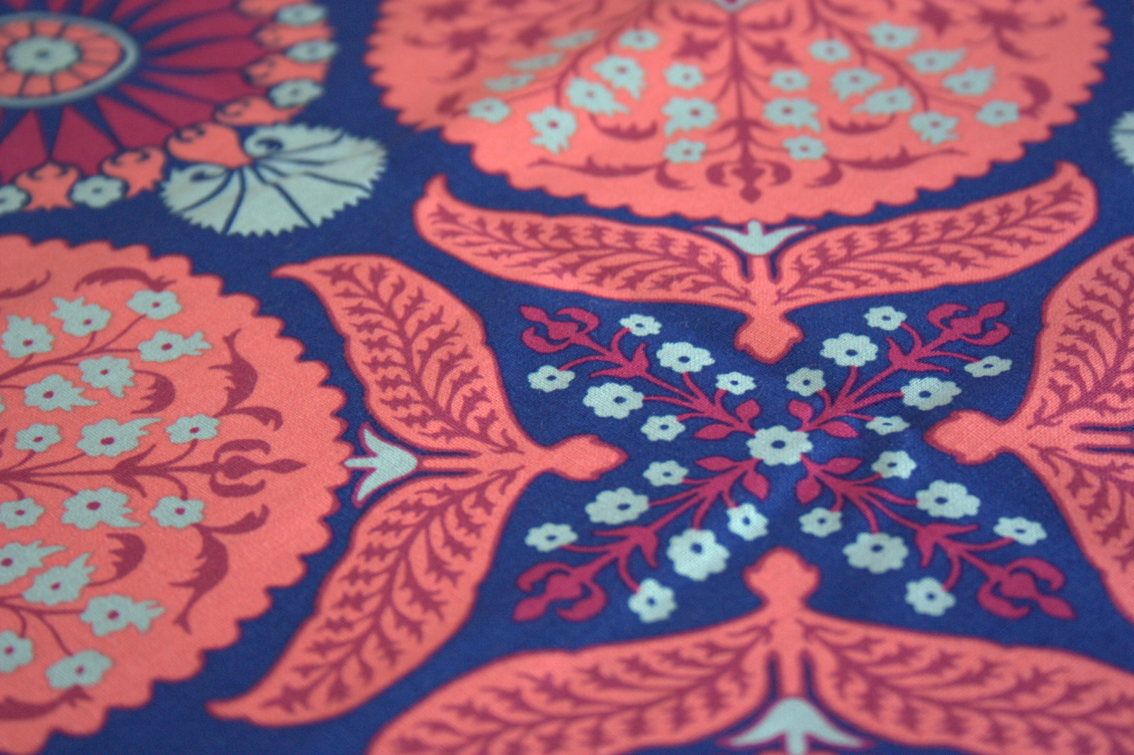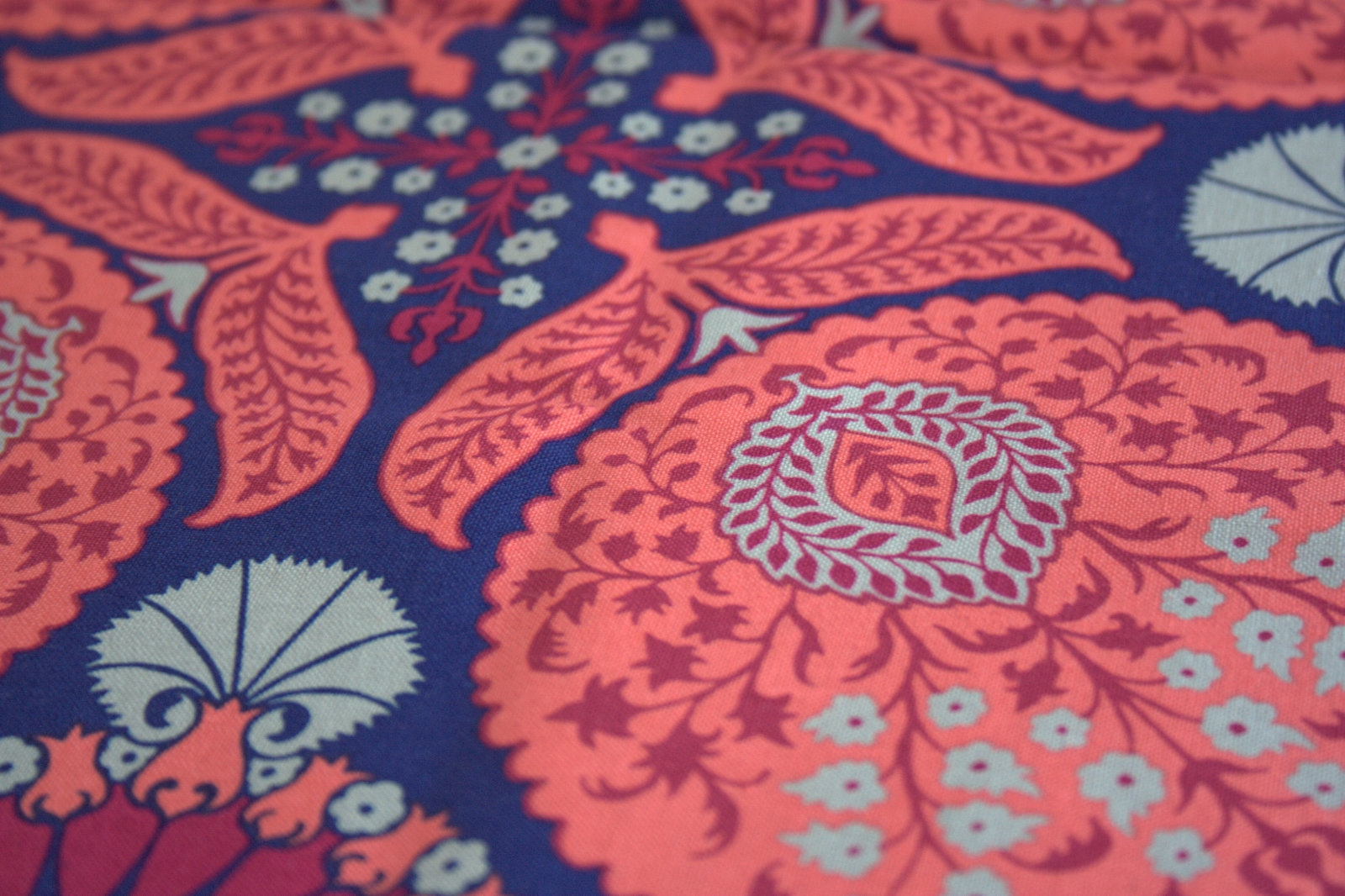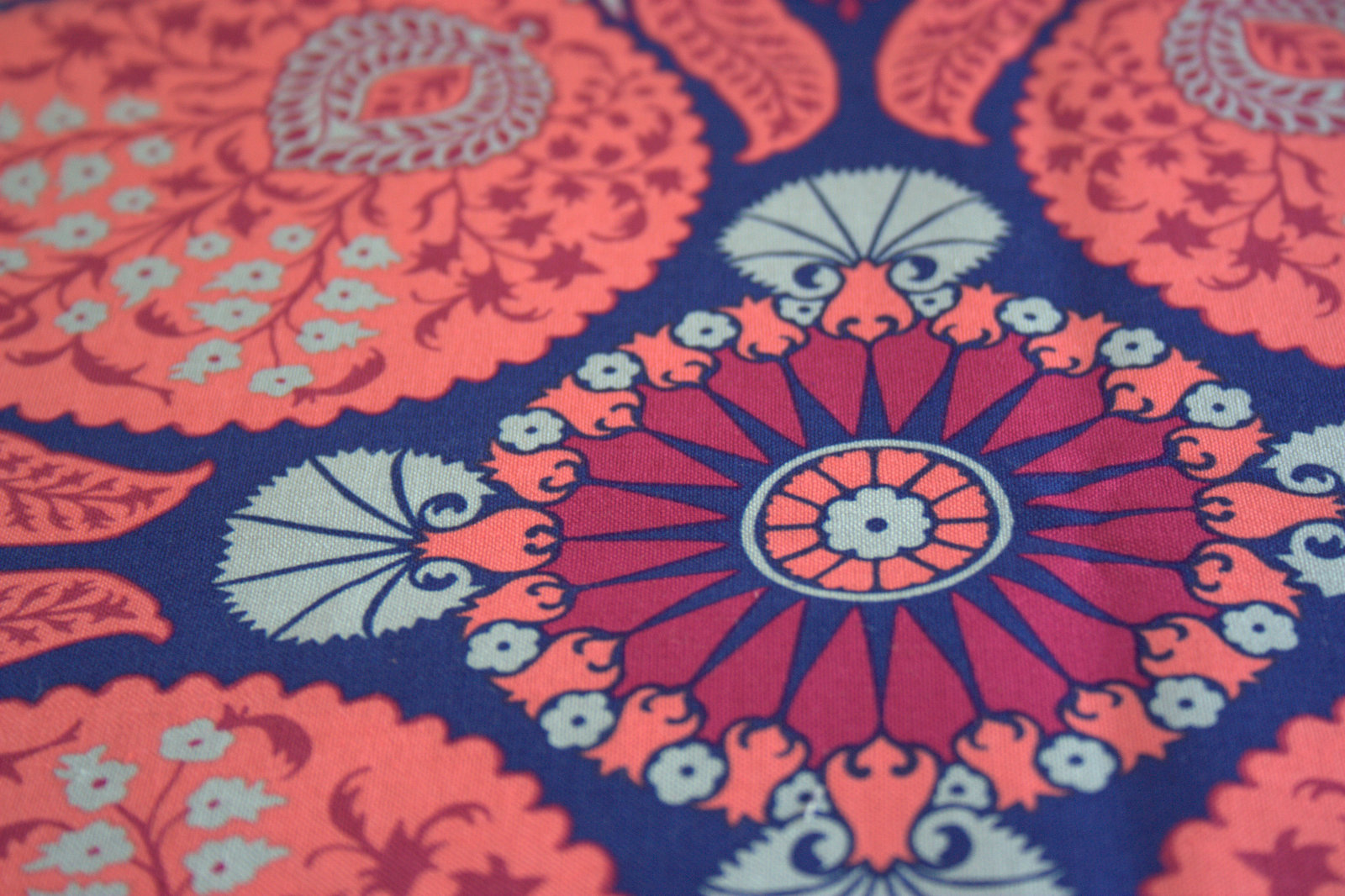 I also bought 1/2 yard of this Floral Bazzar in Orchid by Joel Dewberry for Free Spirit Fabrics. Again, it’s far more floral than I typically buy, but the diverse and detailed print just begs to be meticulously cut and pieced back together. I loved the color combination of the bright navy blue, coral, magenta, and grey and so bought this as a feature fabric for yet another not-yet-planned future EPP project. Just look at all of the variation in this one print!