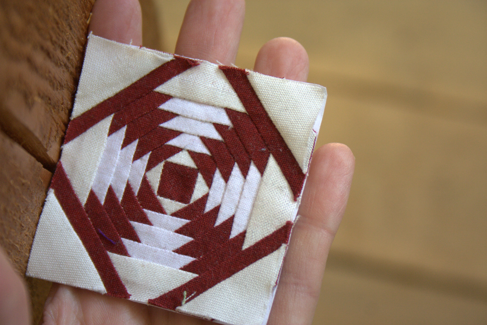 Here’s my 40-minute, not quite 4″ square quilt block start. I am loving it, and being able to use the scraps of fabric from my “too small to save” bin feels good.