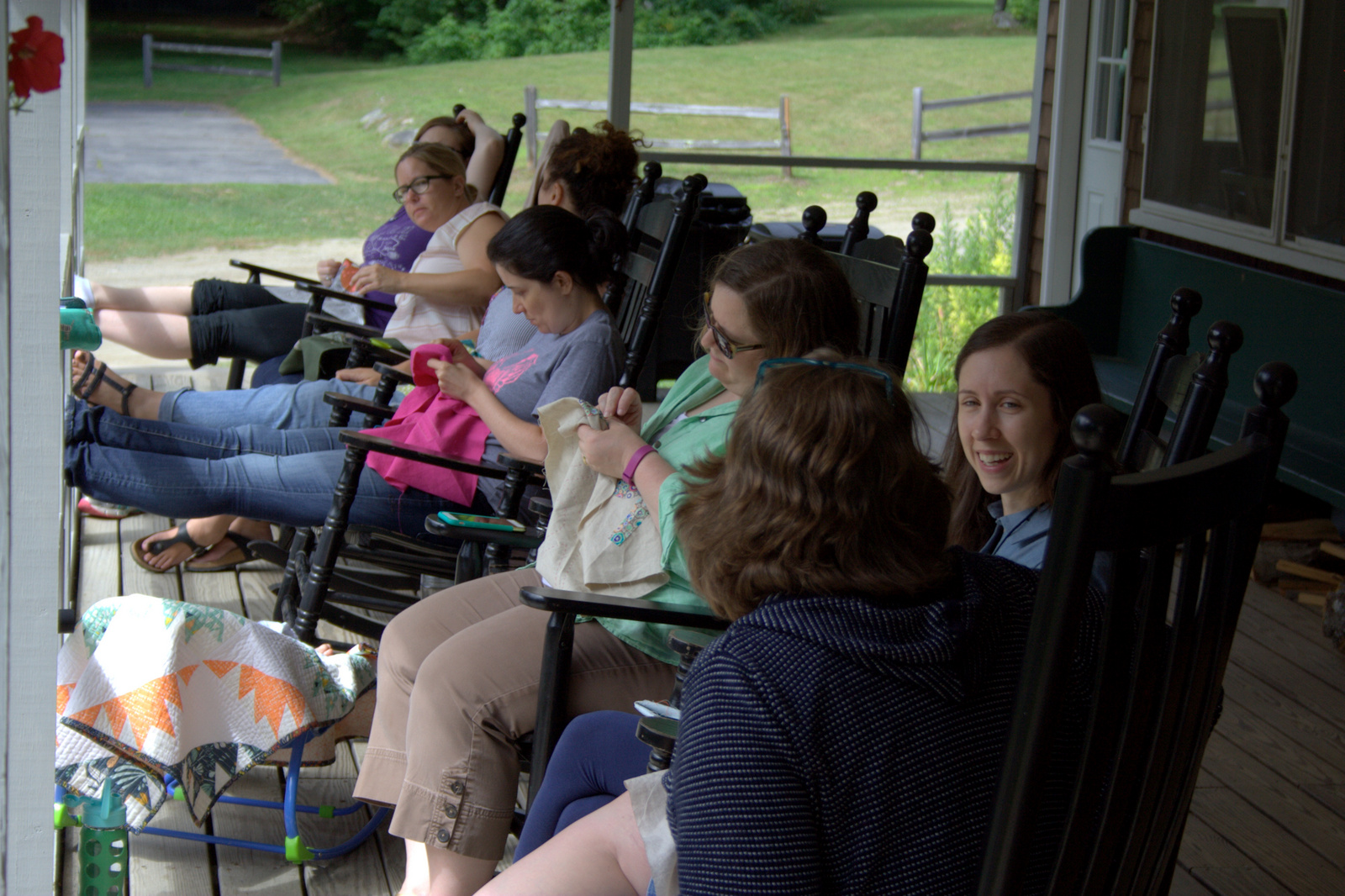 Imagine you’re sitting in a rocking chair on a sunny porch, sunbeams playing at your feet, a cool breeze blowing your hair, fabric in your hands, slowly stitching your way through the day alongside new quilting friends all doing the same, seeing your handwork grow at your fingertips. Bliss, right? Now add amazing quilters Carolyn Friedlander, Chawne Kimber, and Samantha Lindgren as teachers, mentors, and fellow slow stitching friends and there you have the Slow Stitching Retreat at Medomak Retreat Center in Washington, Maine. Last week, I was so blessed to be able to join the retreat for a day, with baby Finn in tow.