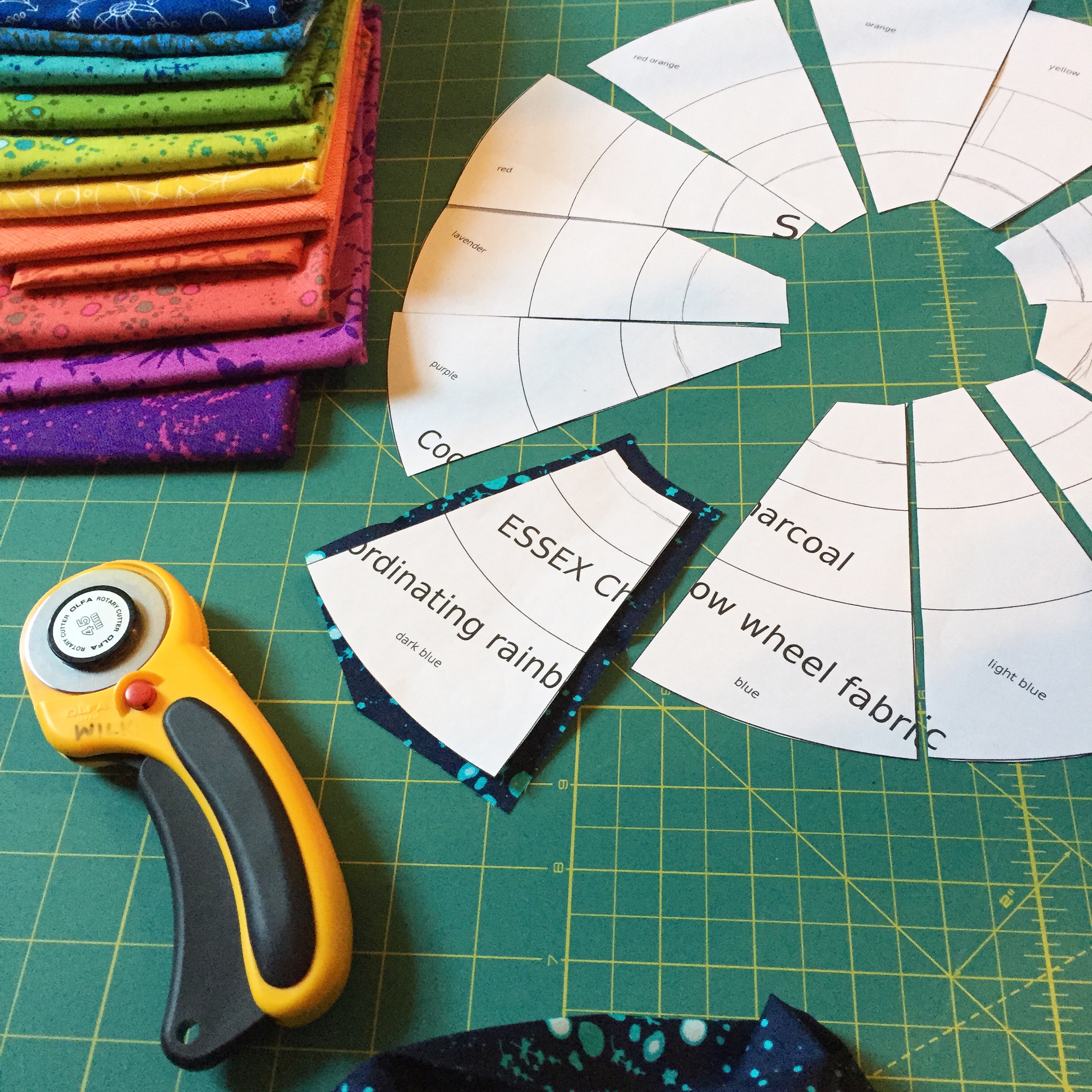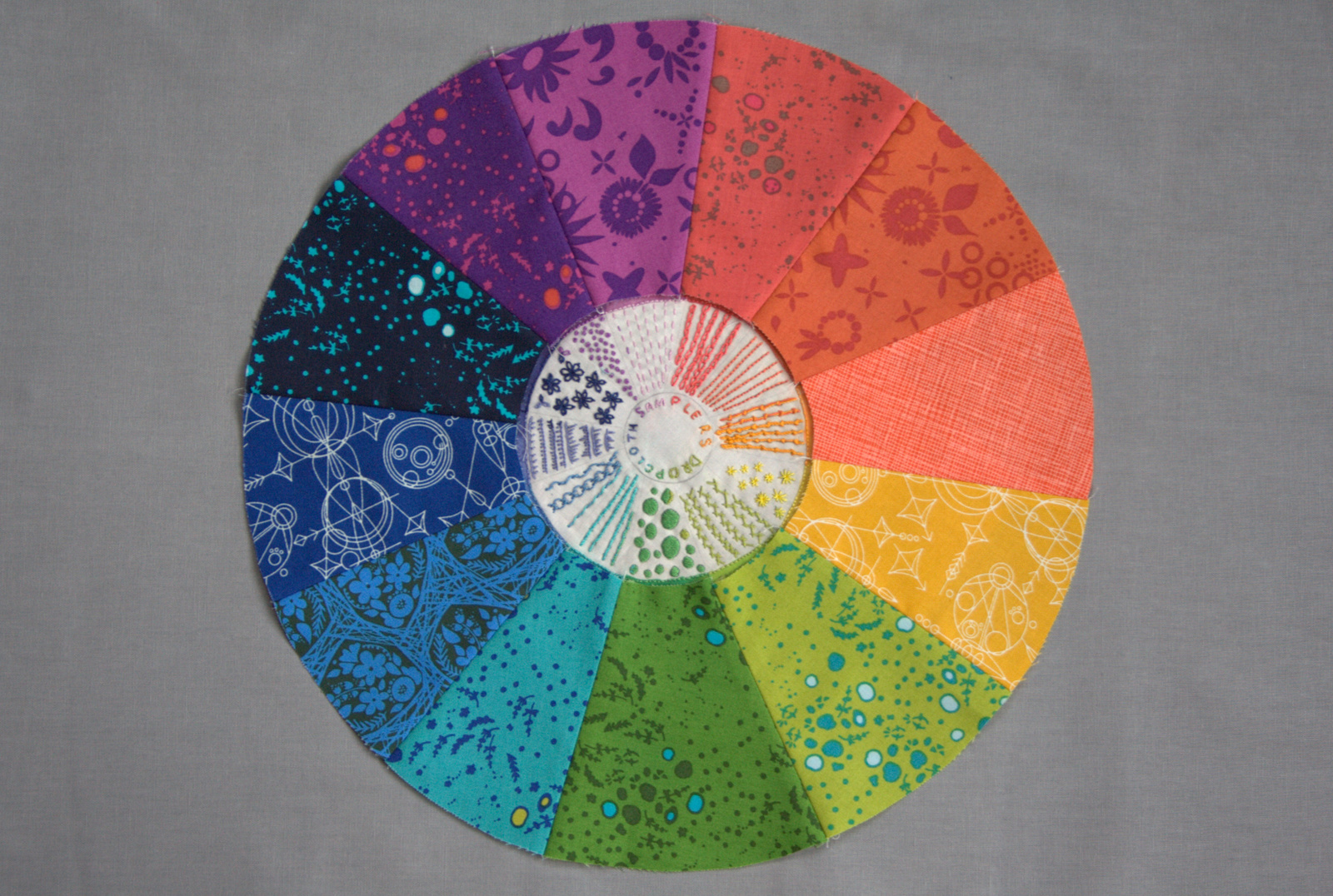 So back to my color wheel. I managed to match the fabrics almost exactly to the colors of the Aurifil embroidery, which is incredible. It seems like Alison Glass and Rebecca Ringquist and Alex from Aurifil must have all gotten together to design this harmonious flow with the perfect combination of design, color, thread, and fabric, it goes together that well. I wanted to be sure that the prongs of the outer color wheel aligned with the organically drawn prongs of the embroidery wheel, so I scanned my embroidery sampler and uploaded it to Inkscape, the free vector program with which I design patterns. I created larger circles, centering the embroidery, and extended the lines on the sampler to create wedges. I then printed it, cut out the wedges with scissors, and used them as templates to cut the fabric wedges, as shown in the Instagram photo above. I winged it, really, but amazingly it came together beautifully.