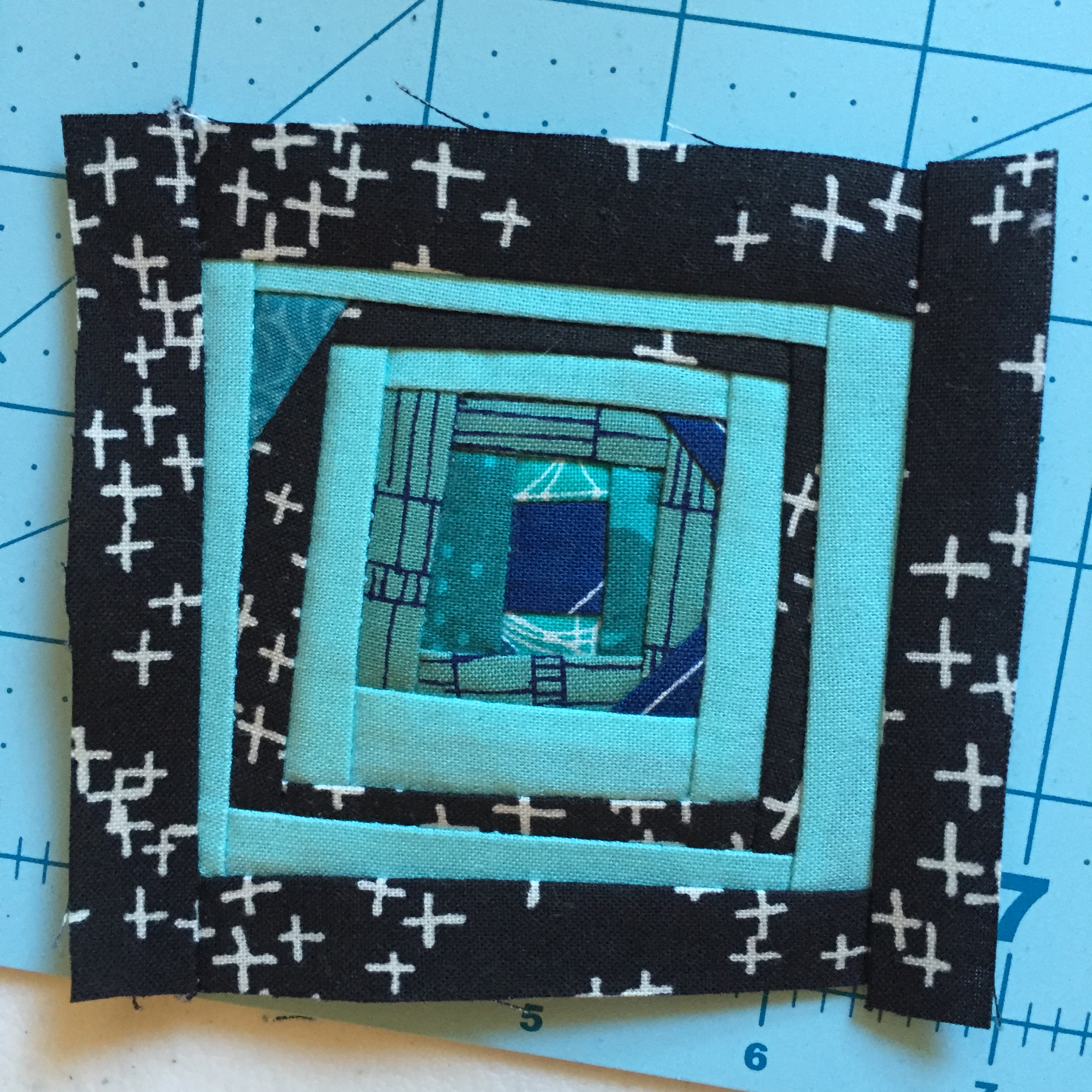 I decided to make another teal block since I still have a lot of teal scraps. I think rather than my usual rainbow, I’m going to stick with a simple color scheme for this quilt: teal and black & white. I really need to sketch out a firm plan, so I’ll make that a goal for month three.