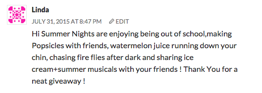 Once again, your comments were my absolute favorite part about the giveaway. To enter the giveaway, I asked you to share what you think of when you hear “summer nights”. Many of you immediately thought of the song from Grease, which honestly had not even entered my mind. Here is just a tiny sampling of some of the other gorgeous images you shared. Honestly, you’re poets!: