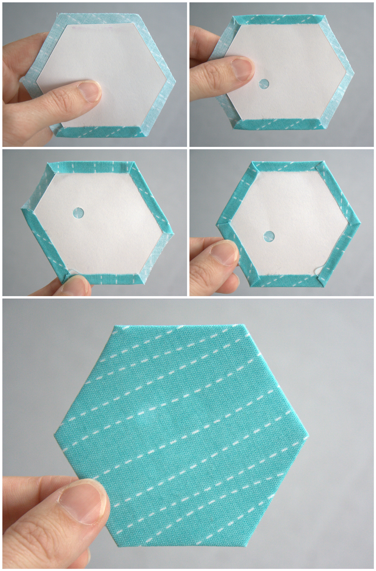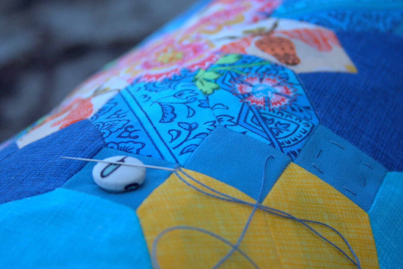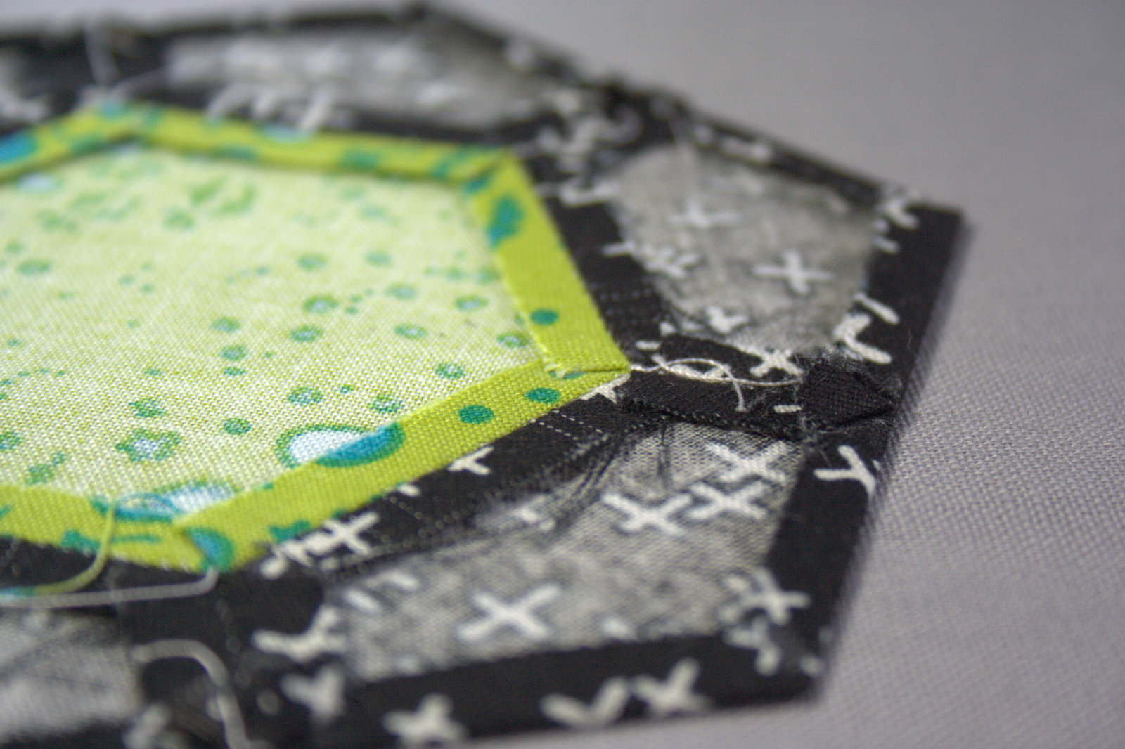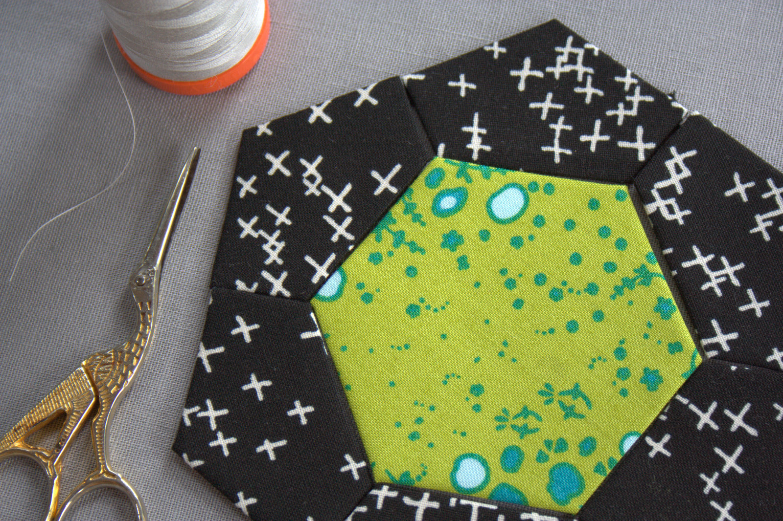 With a knotted thread, beginning at one corner, carefully stitch the two pieces together. The needle should only pass through the edges of the fabric, not the cardstock template, and only needs to catch a few threads of each fabric to hold. Many people use whip stitch to hold the pieces together (shown above). Sew the edge completely, then pick up the next basted piece, hold it right sides facing the next edge of the center hexagon, and continue sewing along that joining edge. There’s no need to knot your thread after each side; continue stitching the pieces together until you either run out of thread or you get to a point where no other piece can be directly joined.