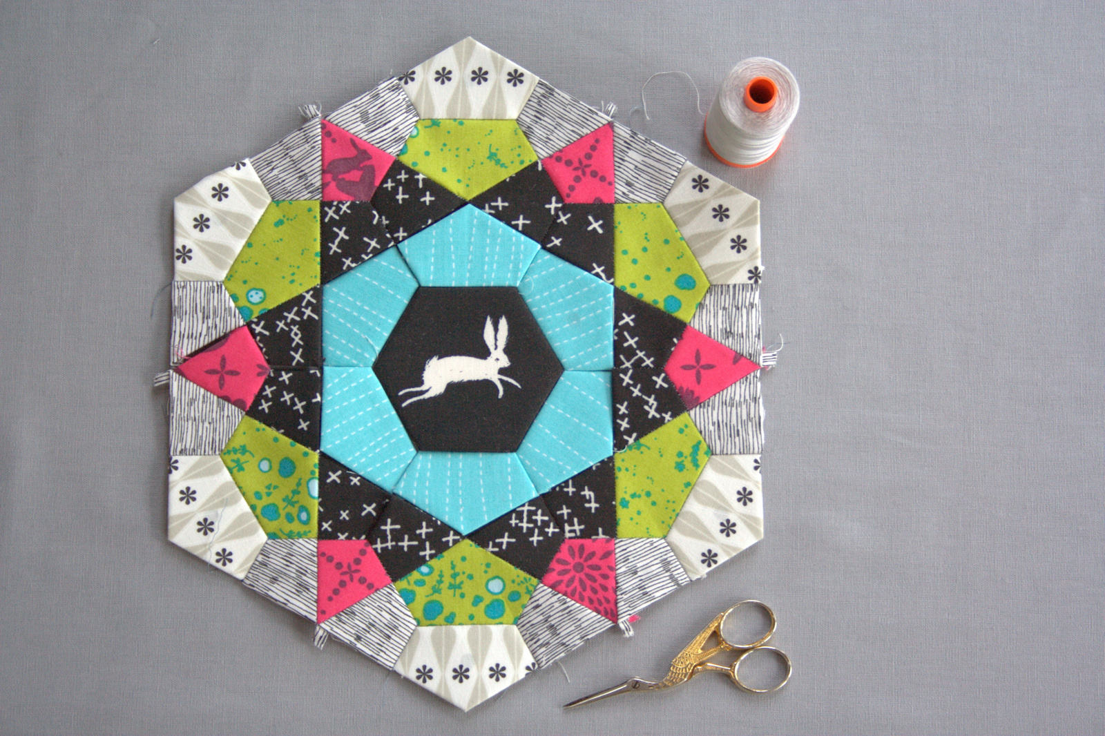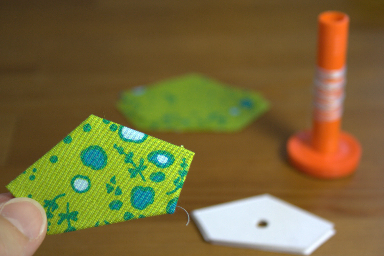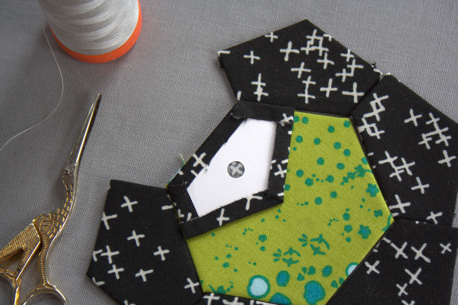 I recently saw the idea of using ladder stitch to join EPP pieces, so had to try it. I LOVED it! With ladder stitch, instead of entering the edge of the fabric from the same side every time as with whip stitch, you pass the needle from the side you’re on to the opposite side with each stitch. It may take a bit more time because of the back and forth of the needle, but I prefer it since it results in a nearly invisible join and I’m a slow and steady stitcher to begin with. Use whichever stitch works best for you and sew all seams. Don’t be afraid to fold your center template in order to get the outer seams lined up and sewn together.