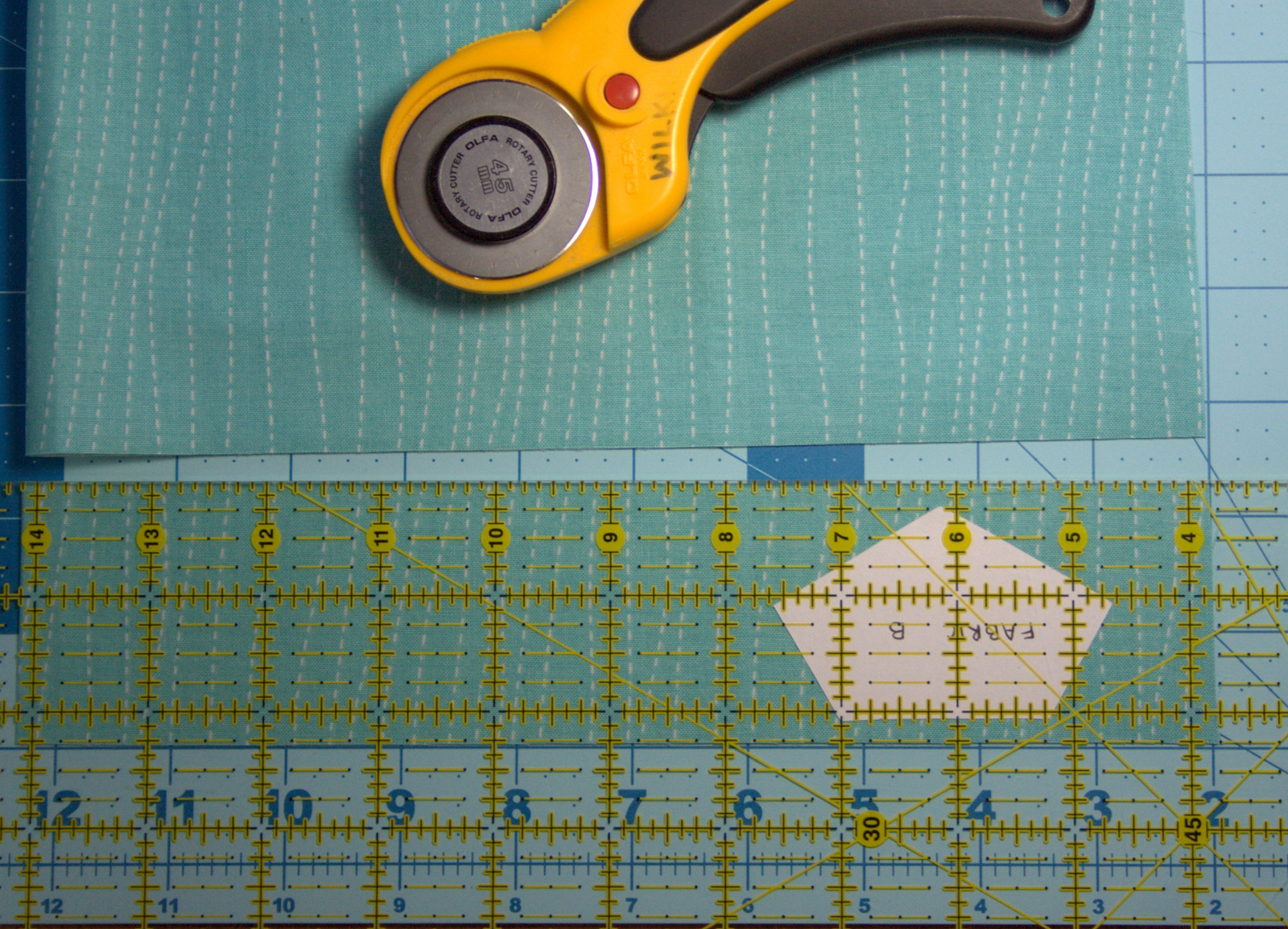 The paper practice pieces can help you save time in cutting, too. For fabric shapes needed in duplicate, use the fabric piece to determine how wide of a fabric strip you will need, then use your rotary cutter and mat to cut a strip. As you can see, I gave myself some wiggle room, but if you’re a die cutting pro, you can really save fabric by lining up the shape flush with the edges of the cut strip.