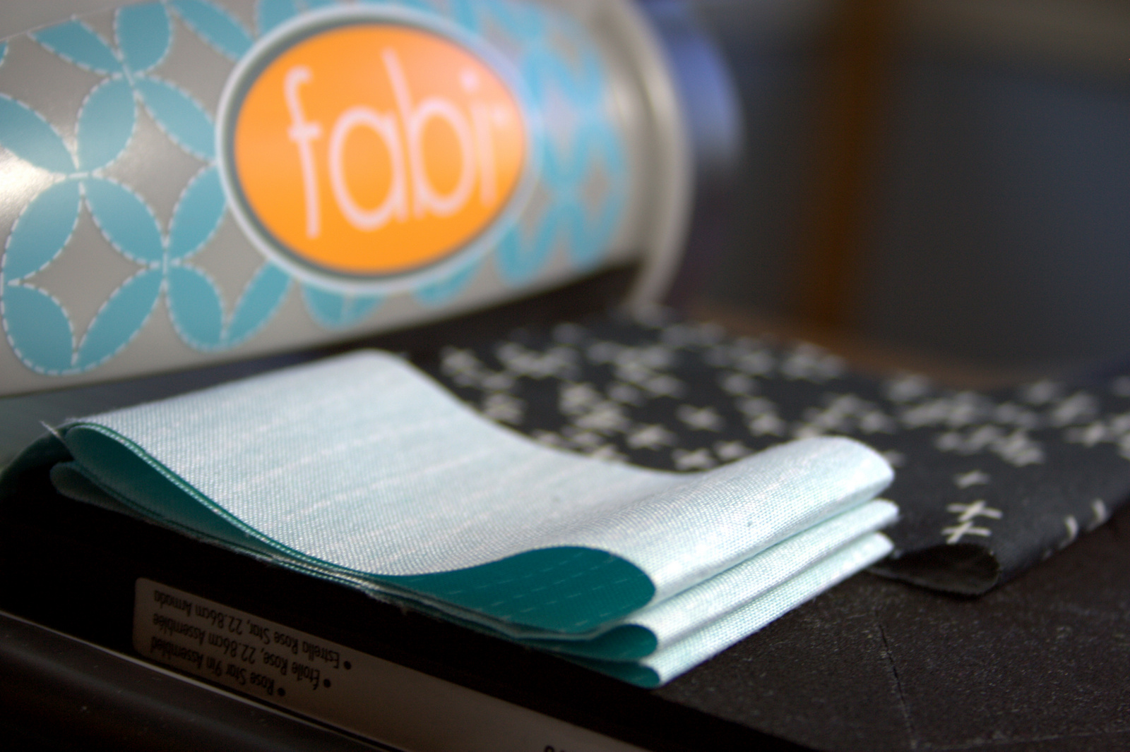 Once you have your fabric strip, fold it accordion style and position it in your Sizzix sandwich: bottom cutting pad, die with the blades facing up, fabric over the fabric blades, and top cutting pad (not shown in this photo). Pass it right through the die cutting machine (or have your three year old crank it through for you), and you’ll have all of the pieces needed for a coaster. You can cut all the fabric needed for a coaster in one pass.