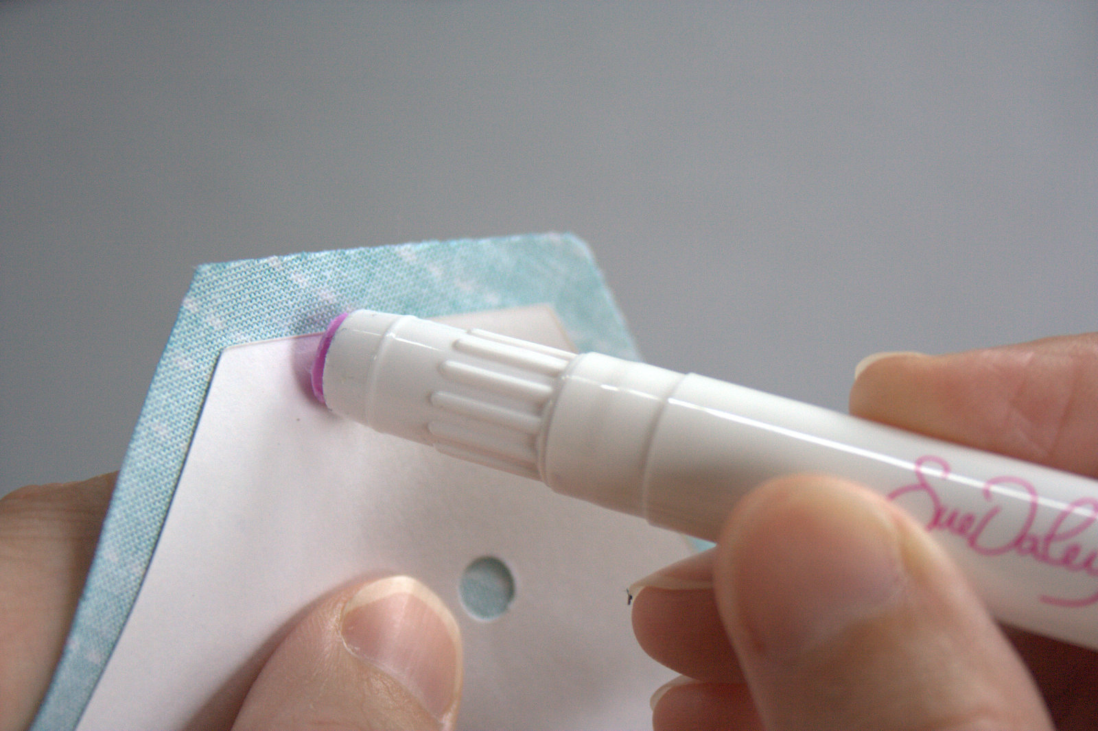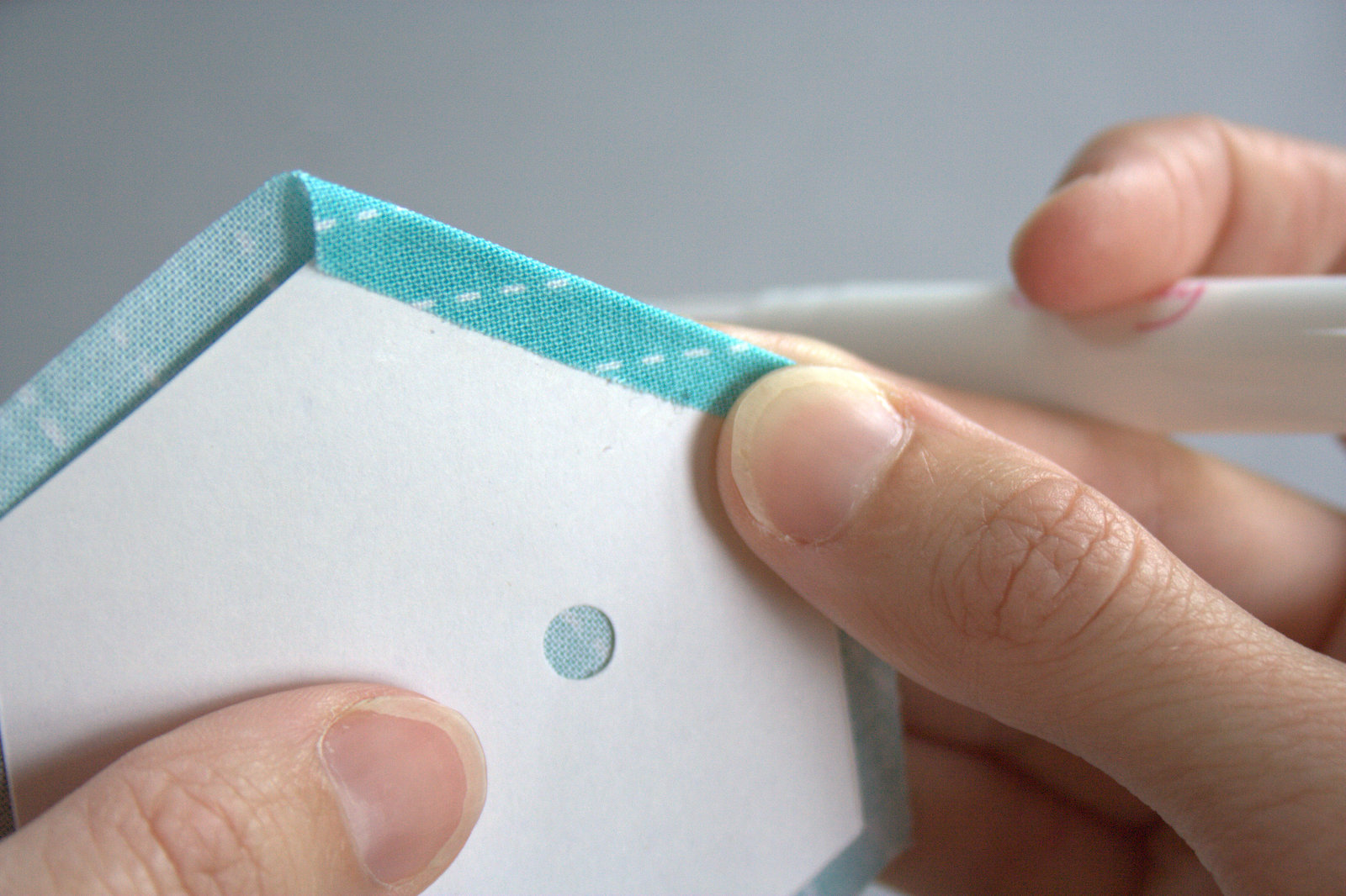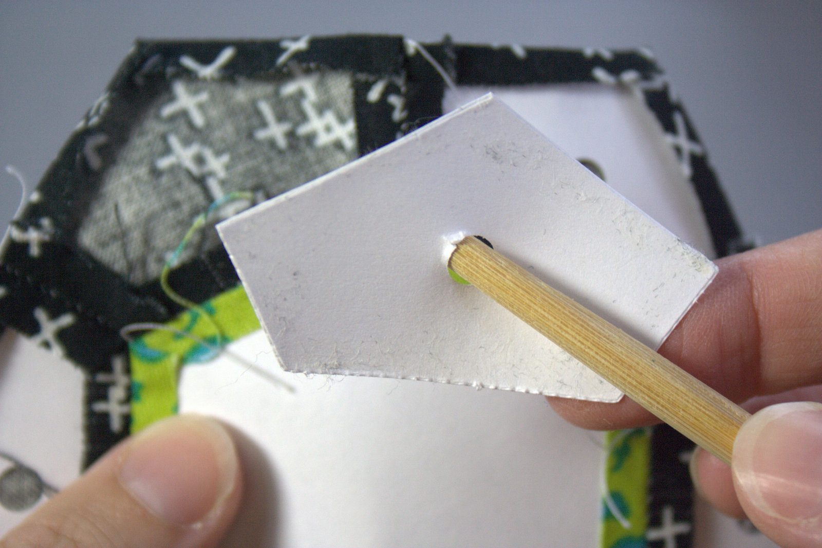 Once the fabric edges are separated from the cardstock template, grab your chopstick and stick the end of it in the hole punched hole of the template.
