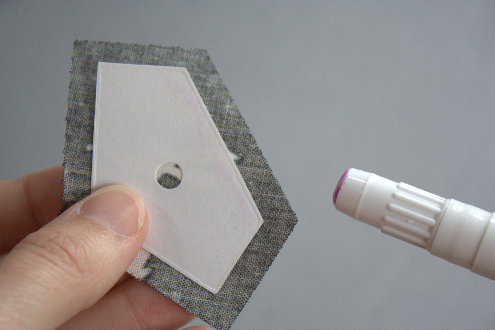 Glue basting is similar to thread basting in that you are securing the fabric around the cardstock template. With glue basting, first put a dab of glue on the center of your template and stick it to the center of the wrong side of your fabric.