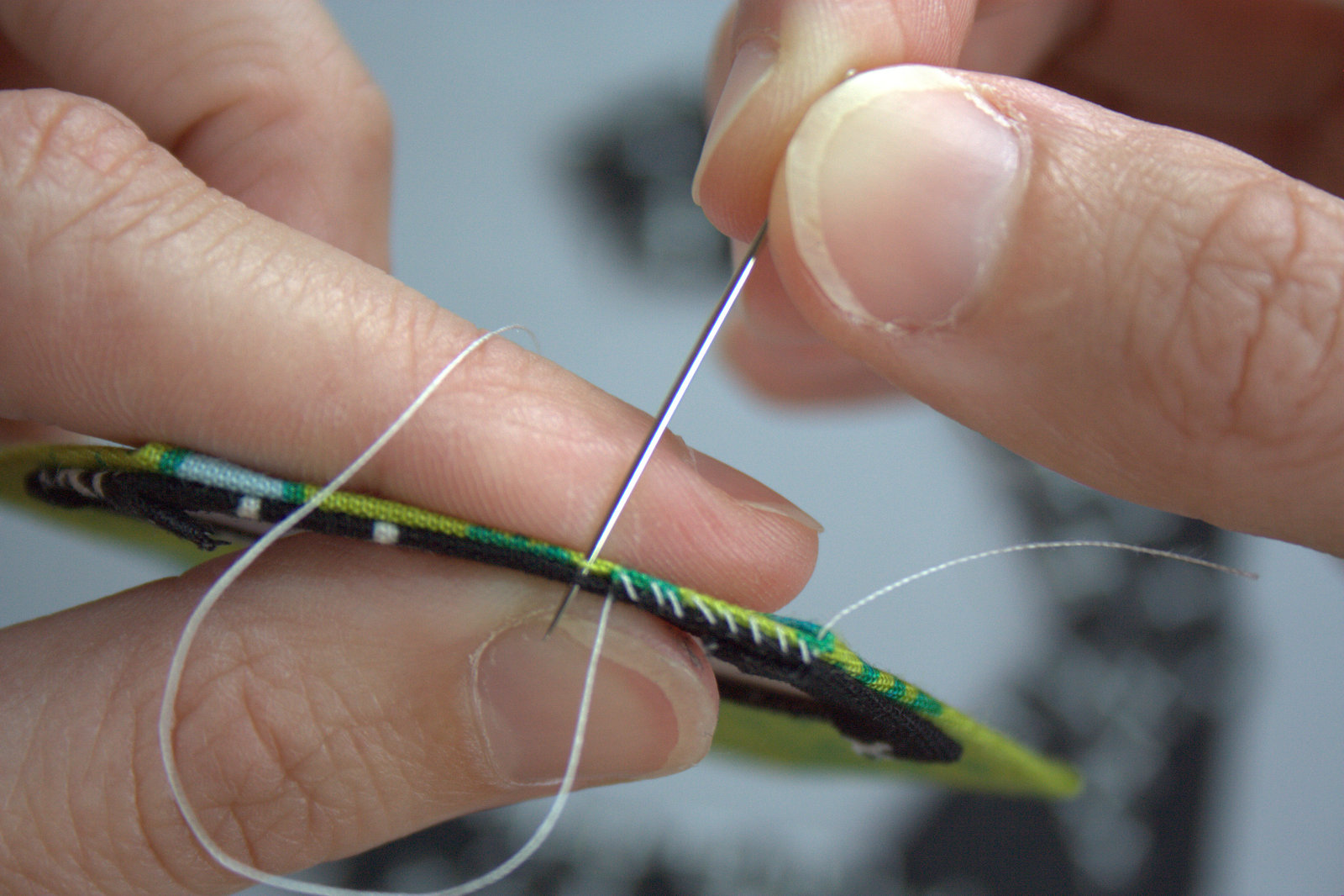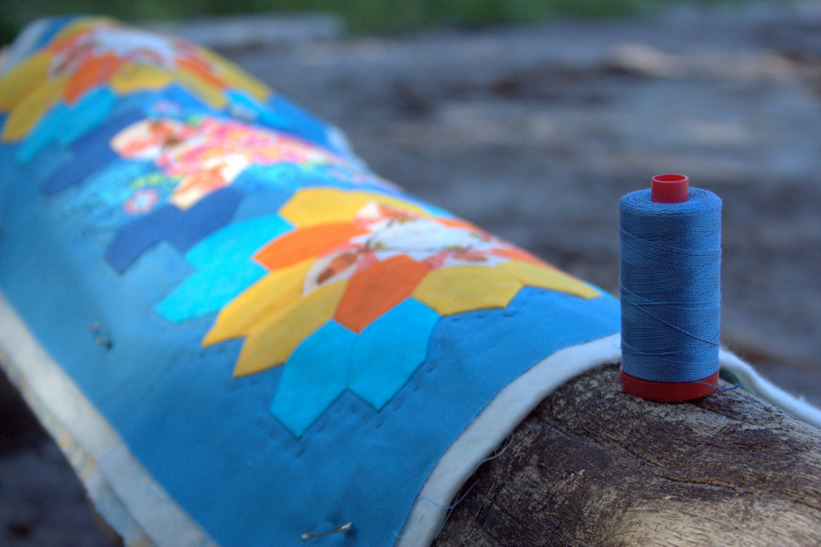 All you need for this step is your basted pieces, sharp scissors, a sewing needle, and some thread in a coordinating color (I love using 50wt Aurifil thread). Sometimes, when the two pieces you’re sewing together are very different colors, there is no color that coordinates with both (like in my case). You can choose one of the colors to match, or just use a neutral color thread. I didn’t have black thread (Aurifil #2692, how have you evaded me!?), so I went with a contrasting light grey (Dove #2600) since I had already decided to quilt these with the contrasting colored thread. Once you have your supplies, this is a great project to take on the go, to stitch here and there.