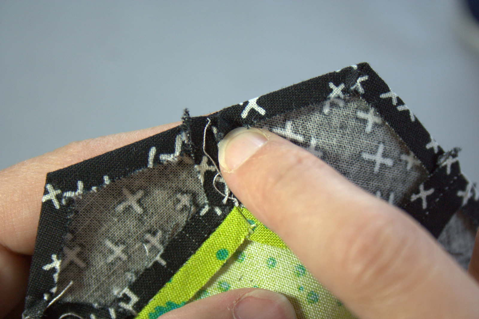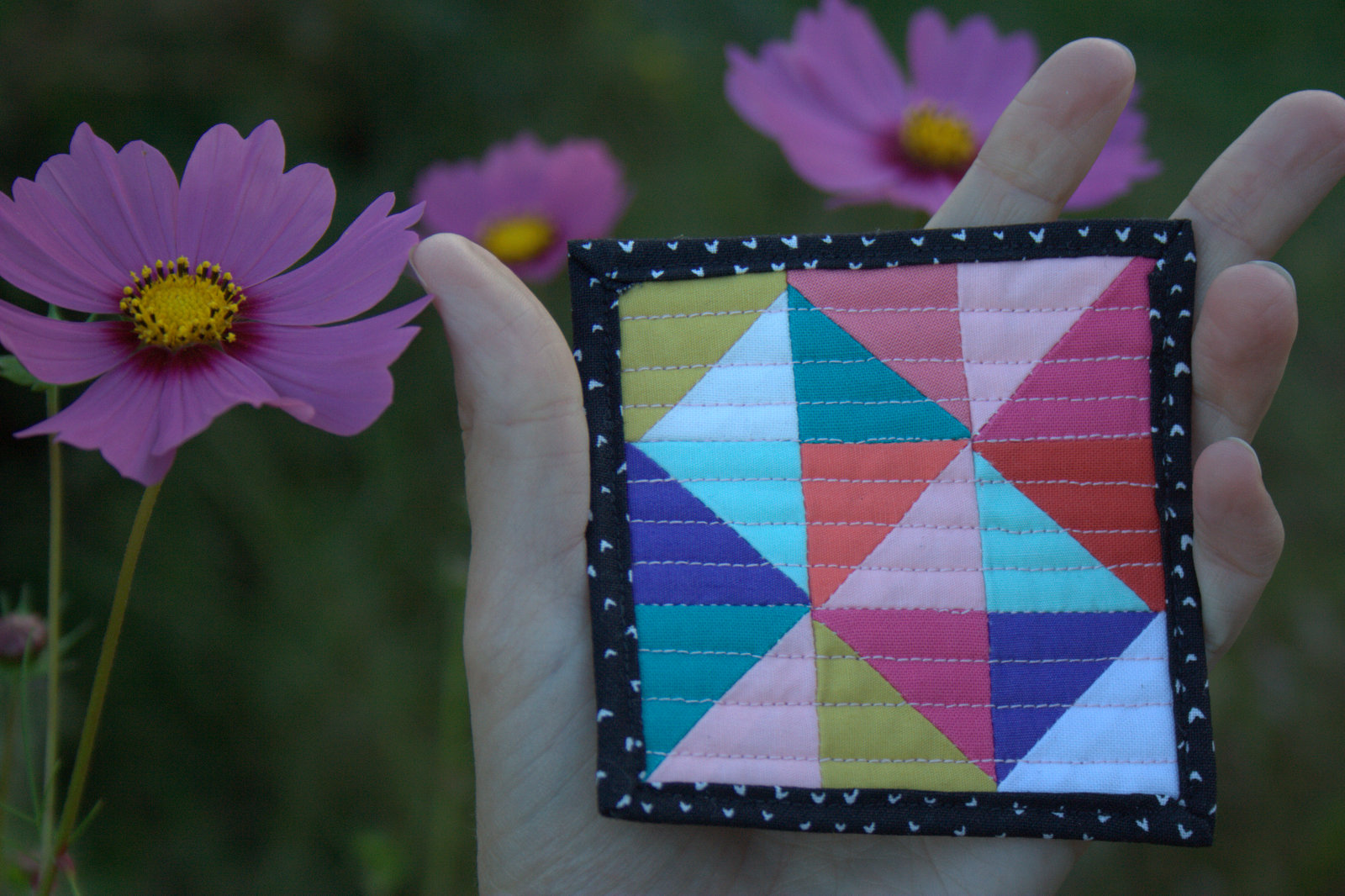 While you’re pressing your coaster top, fold in the edges of your outer seams like you’re making a paper airplane and press well. This will keep them away from the edges when you sew your layers together, keeping the edges of your coaster neat and clean and free from peeking-out seams.
