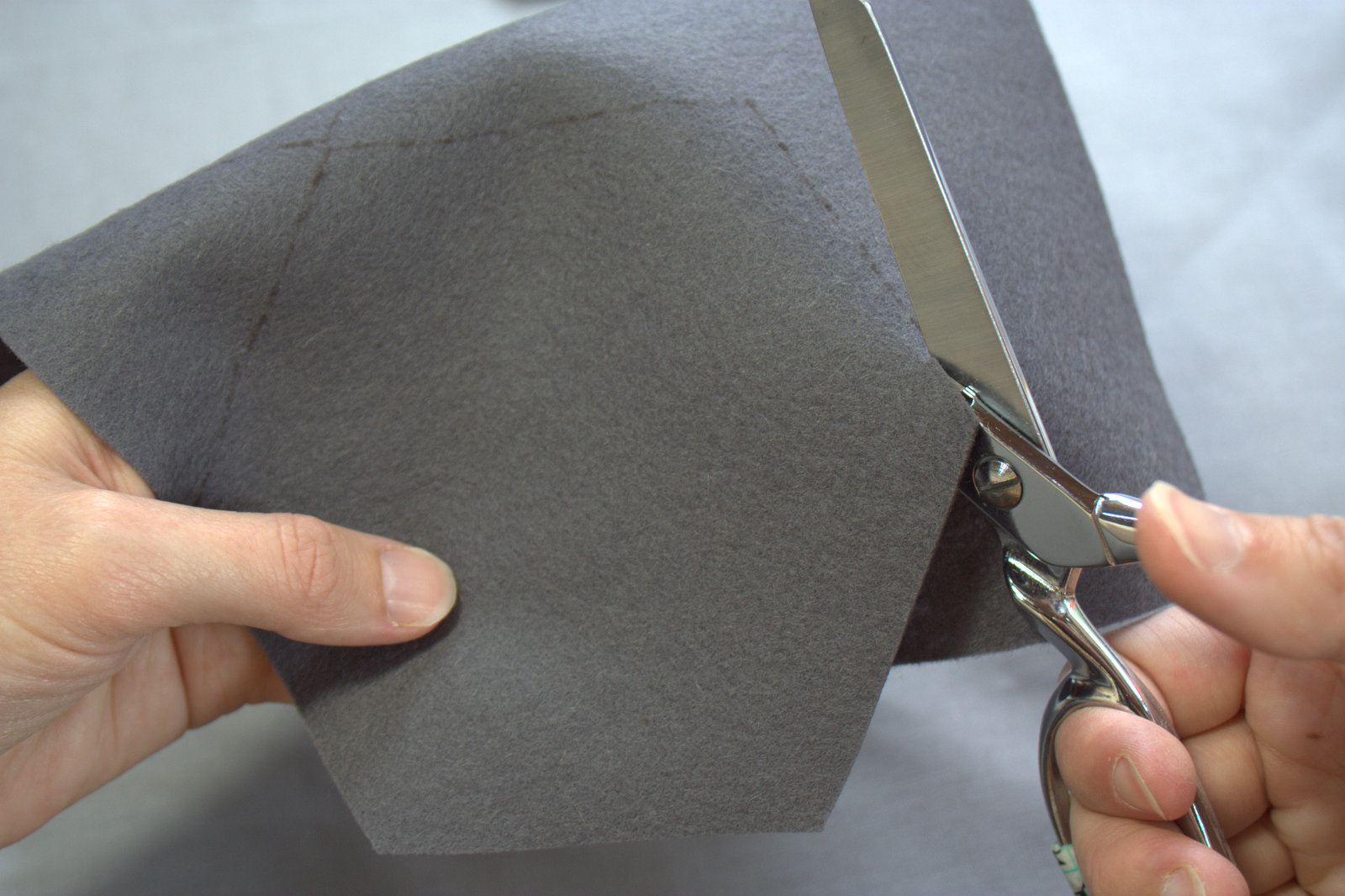 First, trace your EPP top onto a piece of 100% wool felt. I bought mine at my local quilt shop, Fiddlehead Artisan Supply, where there’s a huge wall of gorgeous wool felt from which to choose. Trace one hexagon backing for each of the coaster tops. I used a Sakura Micron pen since we are going to cut just inside the line and therefore it won’t be visible. Plus, Micron pens are the best.