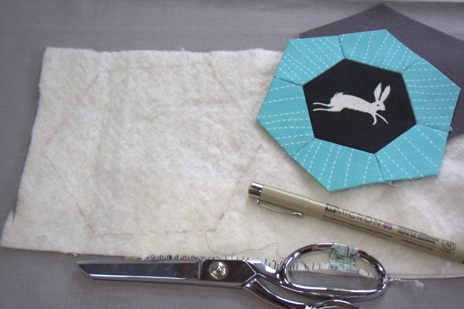 This next step is optional, but if you plan to use the coasters for hot beverages I would recommend it. Gather some batting scraps. This is a great way to use those batting trimmings you’ve cut off the edge of finished quilts. Again, trace your hexagon coaster top and cut out along the line.