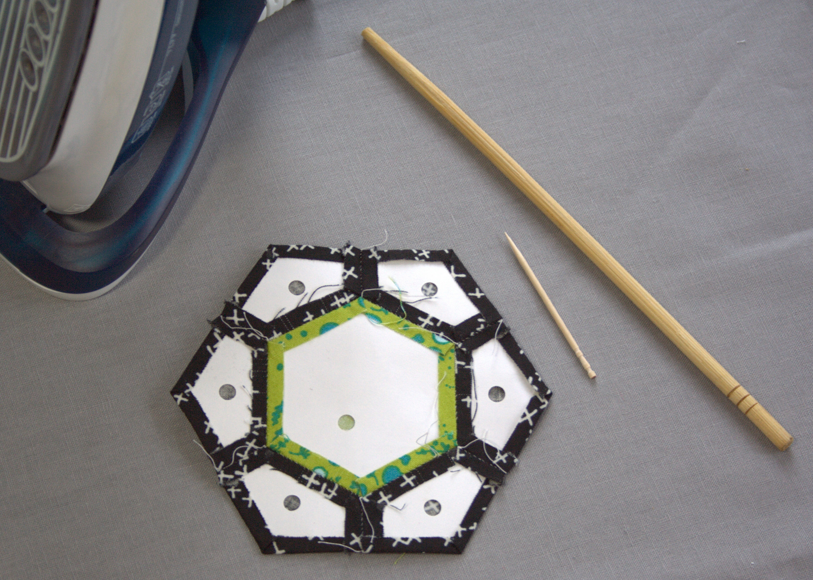 Now, back to your coaster tops. It’s time to take out those template papers! You will need your EPP coaster tops, a toothpick, a chop stick (or crochet hook), and an iron. Trust me, and no, we’re not making dinner!