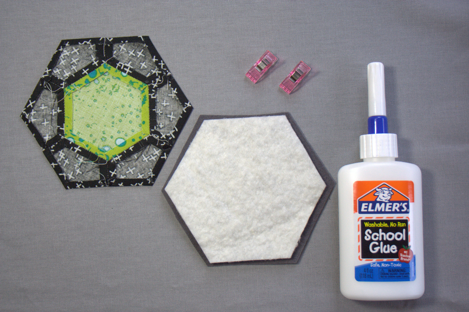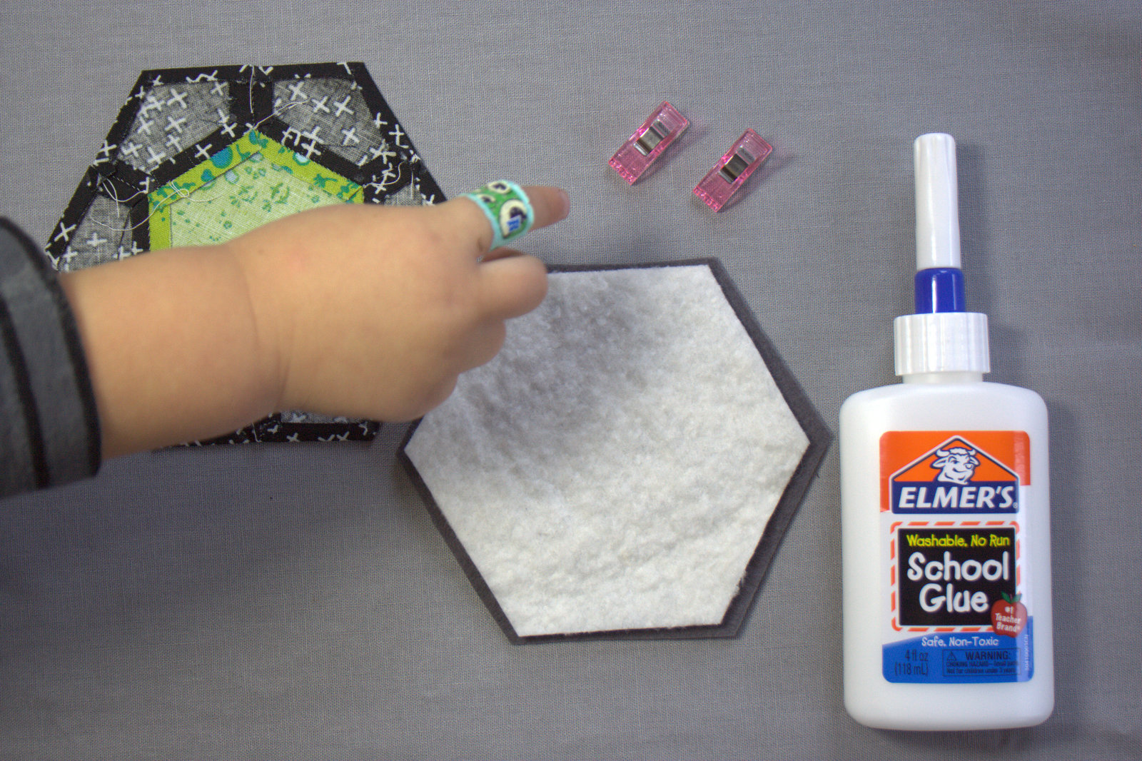 Now it’s time to assemble our coasters! You can probably just pin the layers together: felt on the bottom, then batting, then EPP coaster top, but I like to glue baste and use Clover Clips* to hold the layers together before sewing since it results in a nearly perfect alignment.