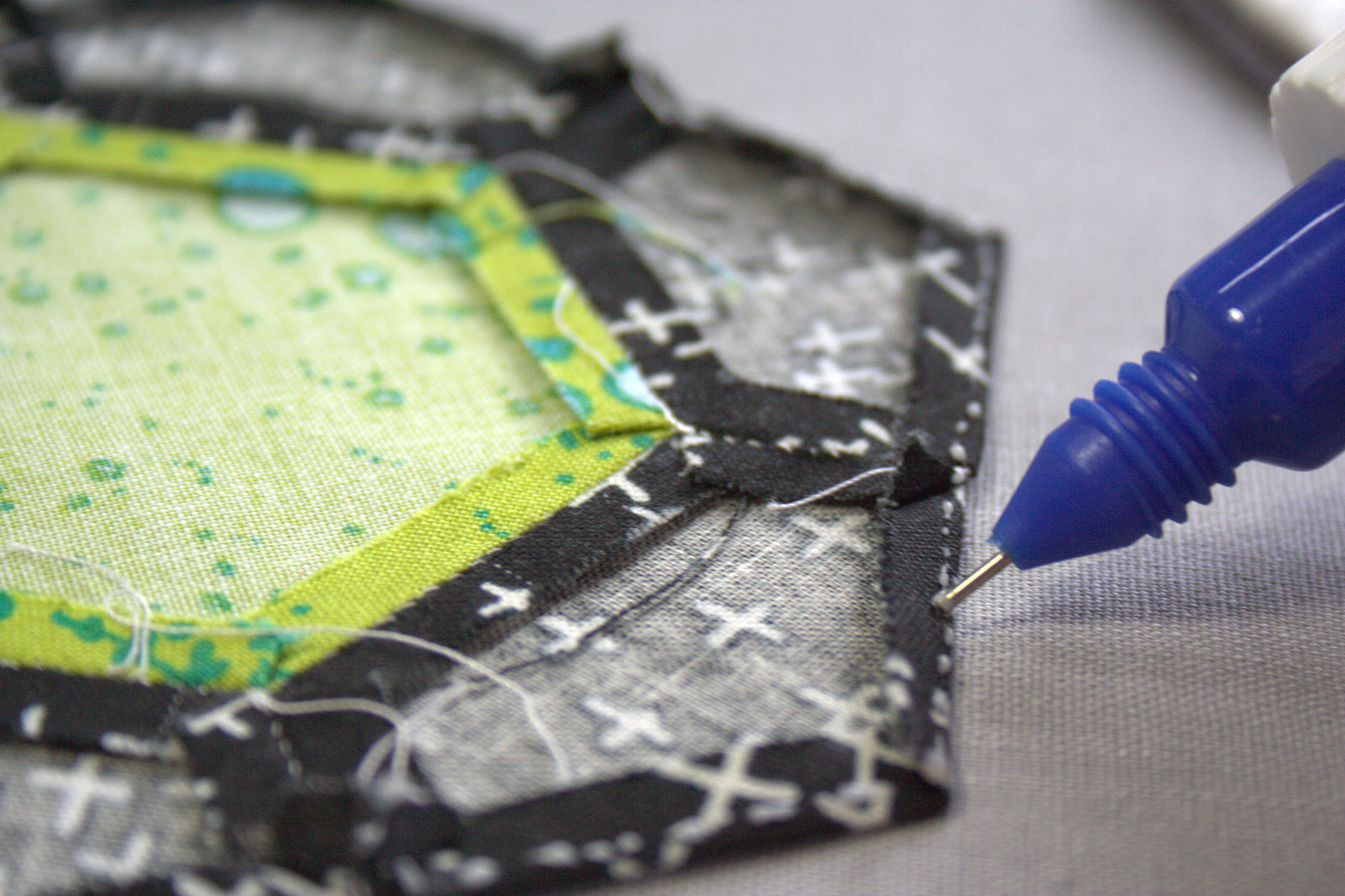 Continue glue basting all of the pieces needed for your coaster. With irregular shapes, start by gluing the longest side to help make the process smoother.