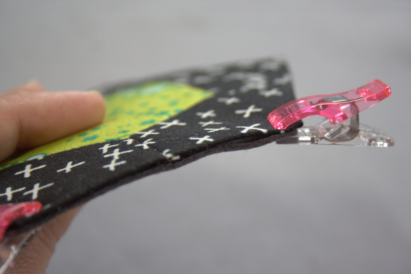 Assemble your layers: wool felt on the bottom, then batting centered within that, then EPP coaster top carefully positioned on top. Give it a gentle press with a warm iron (note that wool is now involved) to set the glue. Clover clip the edges for extra stability and head over to your sewing machine!