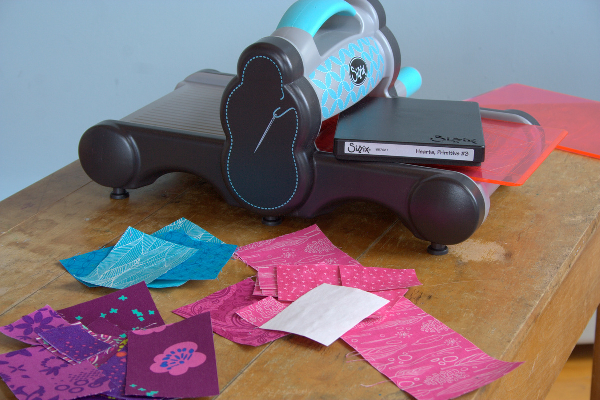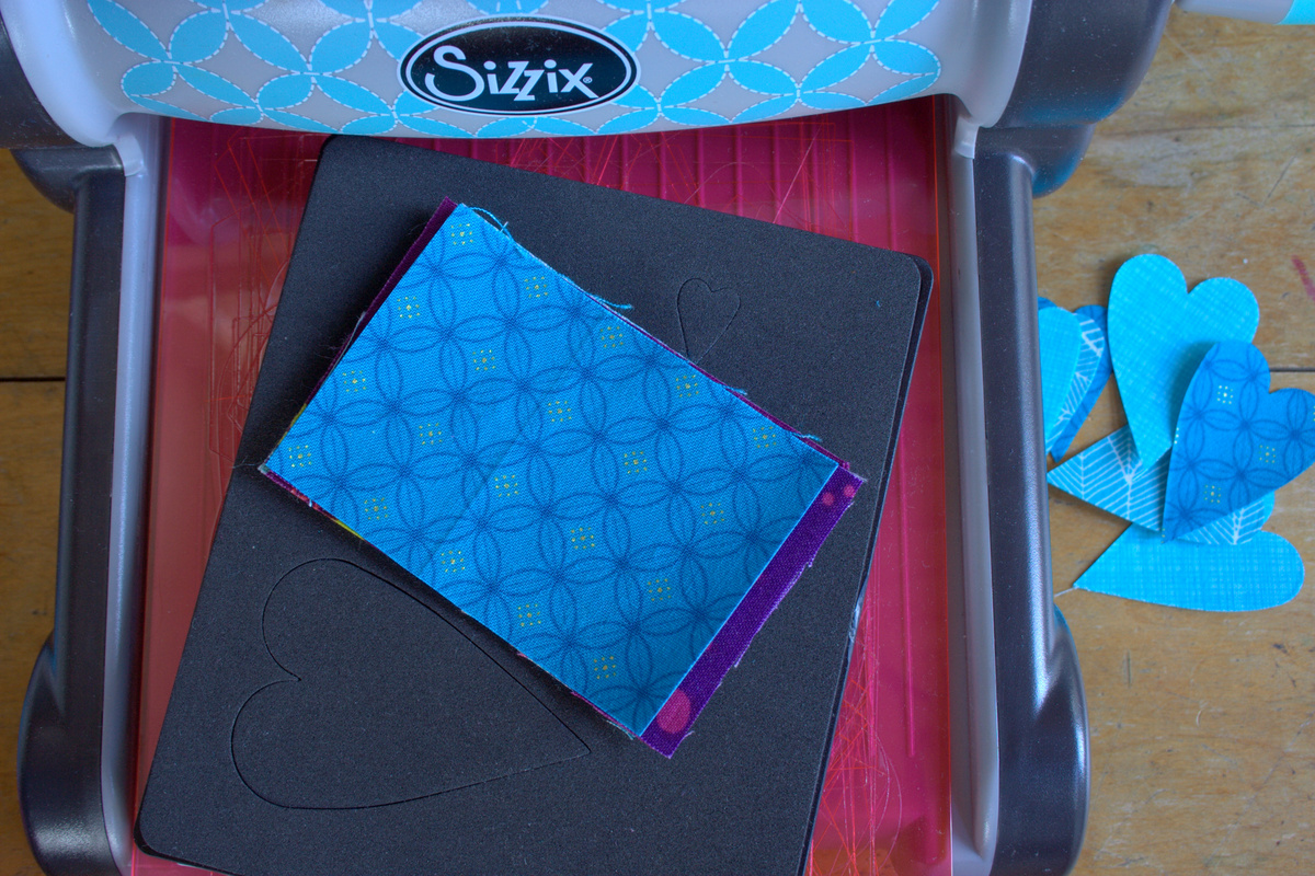 Next, pull out your Sizzix fabi die cutting machine and Primitive hearts #3 die. Call those children back! Layer the pre-fused fabric rectangles over the desired sized hearts on the Primitive Hearts die, four (4) at a time. The Sizzix can cut up to nine (9) layers of fabric at once, but since the fusible is pre-fused, each rectangle counts as two layers. Make your Sizzix sandwich: bottom cutting pad, die with the blades facing up, fabric centered over the heart blades, and top cutting pad.