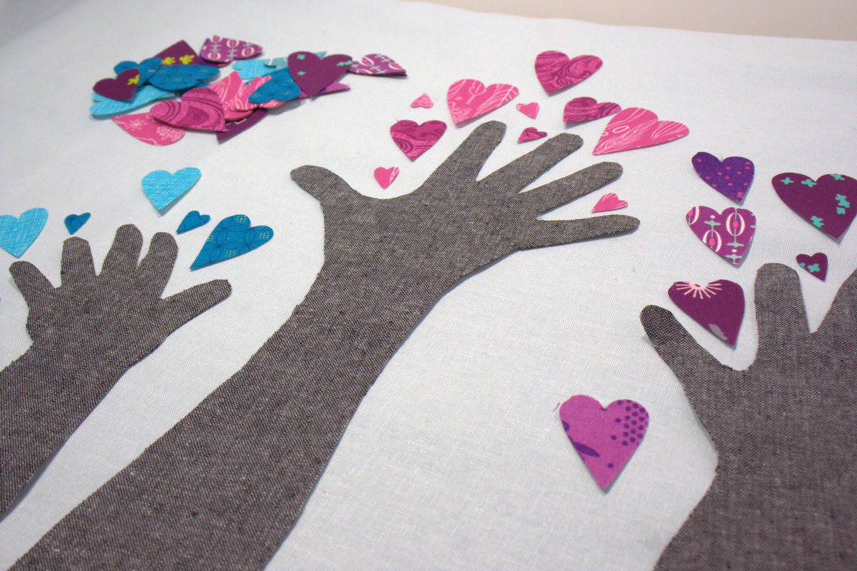Lay out a large piece of your background fabric. I suggest arranging your tree or grove of trees BEFORE cutting the background fabric to size, since every child’s arm is different. Layout your tree trunk(s), arranging the hearts around the top like the leaves of a tree.