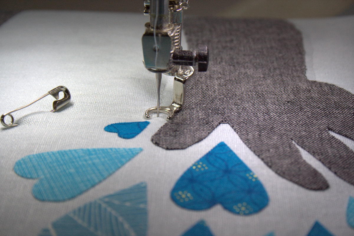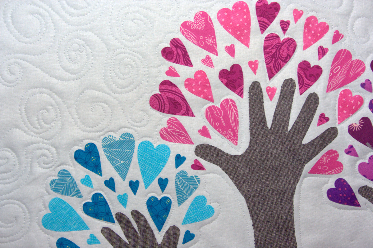 With a thread that coordinates with your background fabric, free motion quilt AROUND the edges of your tree trunk(s) and hearts. I also stitched around a few single hearts (you don’t need to sew around all of them) within the tree. Remember that the Heat’n Bond is NO SEW, so be sure not to sew on top of the fused pieces. Feel free to free motion quilt the background to help hold everything in place. I used a windy spiral design and was reminded at how much fun free motion quilting is! I need to do it more often!