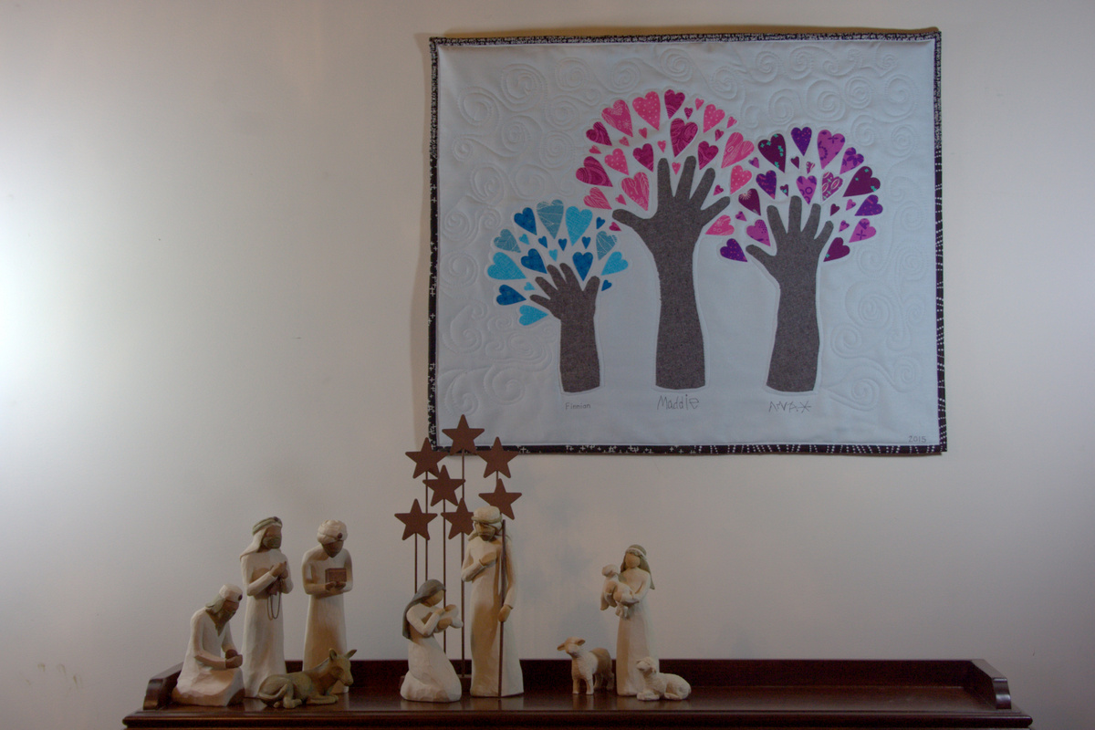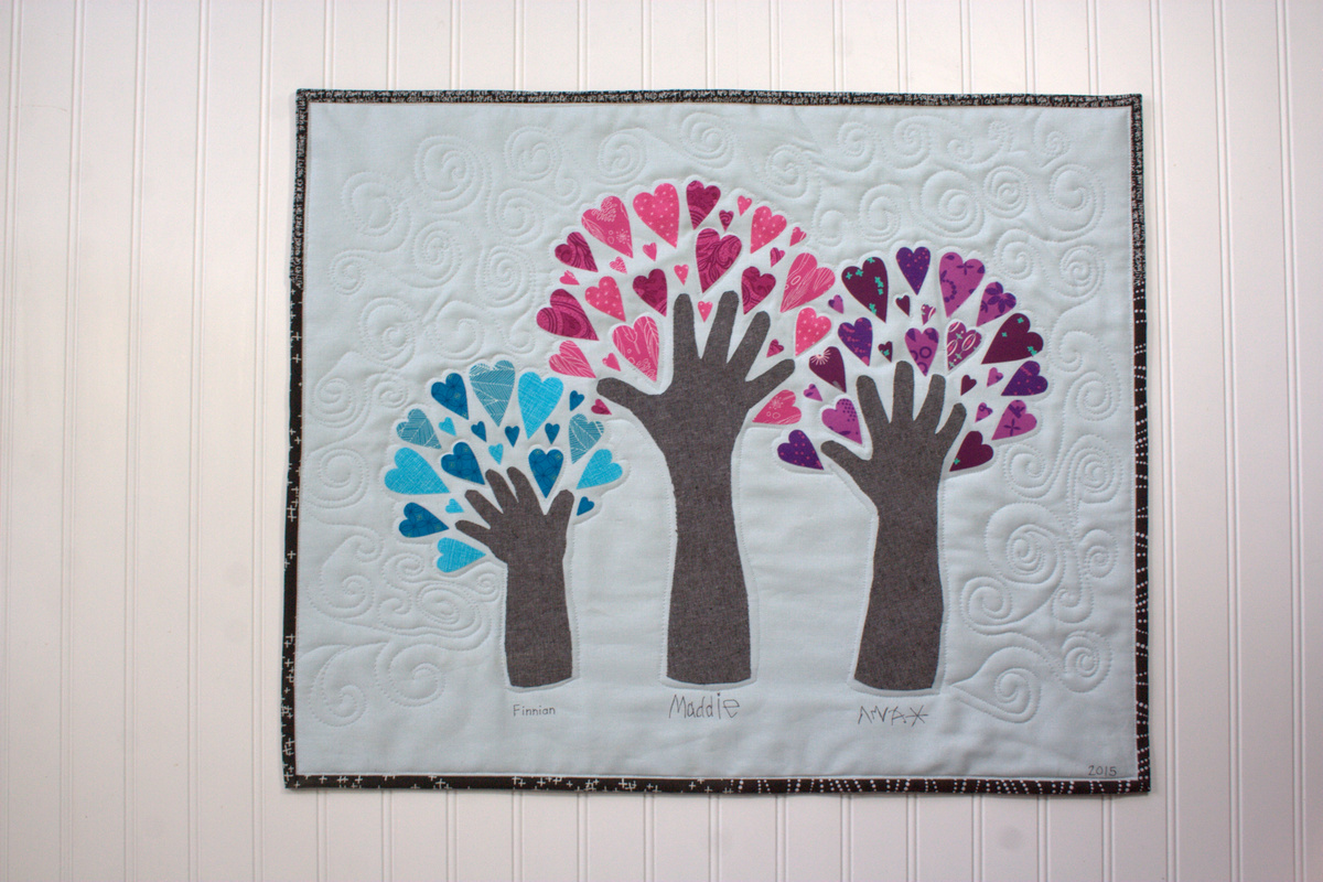 From the moment I gave birth to my first child, my holiday gift giving style changed completely. Instead of trying to think of the “thing” each family member would like or need most and focusing all of my time on making handmade gifts of love for every family member possible, I acknowledge that presence is the best present if at all possible, and as a busy mom (of three lovely children, now), gift making time is much more rare. I am blessed to have a large family, and to have married into an even larger family, so potential gift recipients abound. But especially in recent years, my parents and in-laws–the grandparents–are usually the sole recipients of Christmas gifts, and such gifts nearly always involve their cherished grandchildren (our kids). This year, grandparents will get a whole lot of love, since time wasn’t on my side with this project. When I had the idea to make heart-filled trees out of my children’s hands, I did my typical google search to see if it had been done before. I found this post, about a creation inspired by another creation, and I knew that that inspiration would need to take one more step into the quilting world to become a quilted gift. Here’s how to make your own Growing Tree.