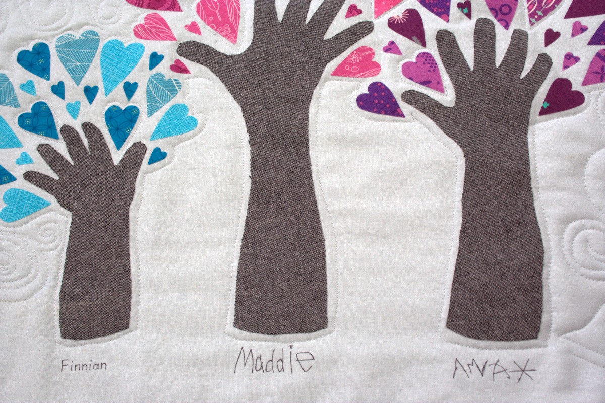 Add each child’s name beneath each tree, either with embroidery or permanent fabric marker. I used fabric marker so that Maddie and Max could include their signatures. Don’t forget the date! (Confession: I copied Max’s signature from a recent art project since I didn’t dare let him and a permanent fabric marker near this finished project. Perhaps a 3 year old with a less impish nature might be able to sign right on the project, but use your judgement.)
