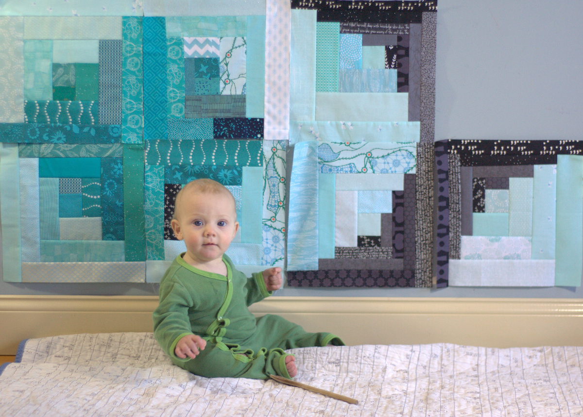 Not much stands in Finn’s way these days. Trying to get him to stay on the quilt near his quilt block was tricky, so most of the photos this week are movement or snuggle photos. I’m sure you don’t mind. This was what I saw less than a minute after putting him down right next to the wall. “I want to play, Mommy!”…
