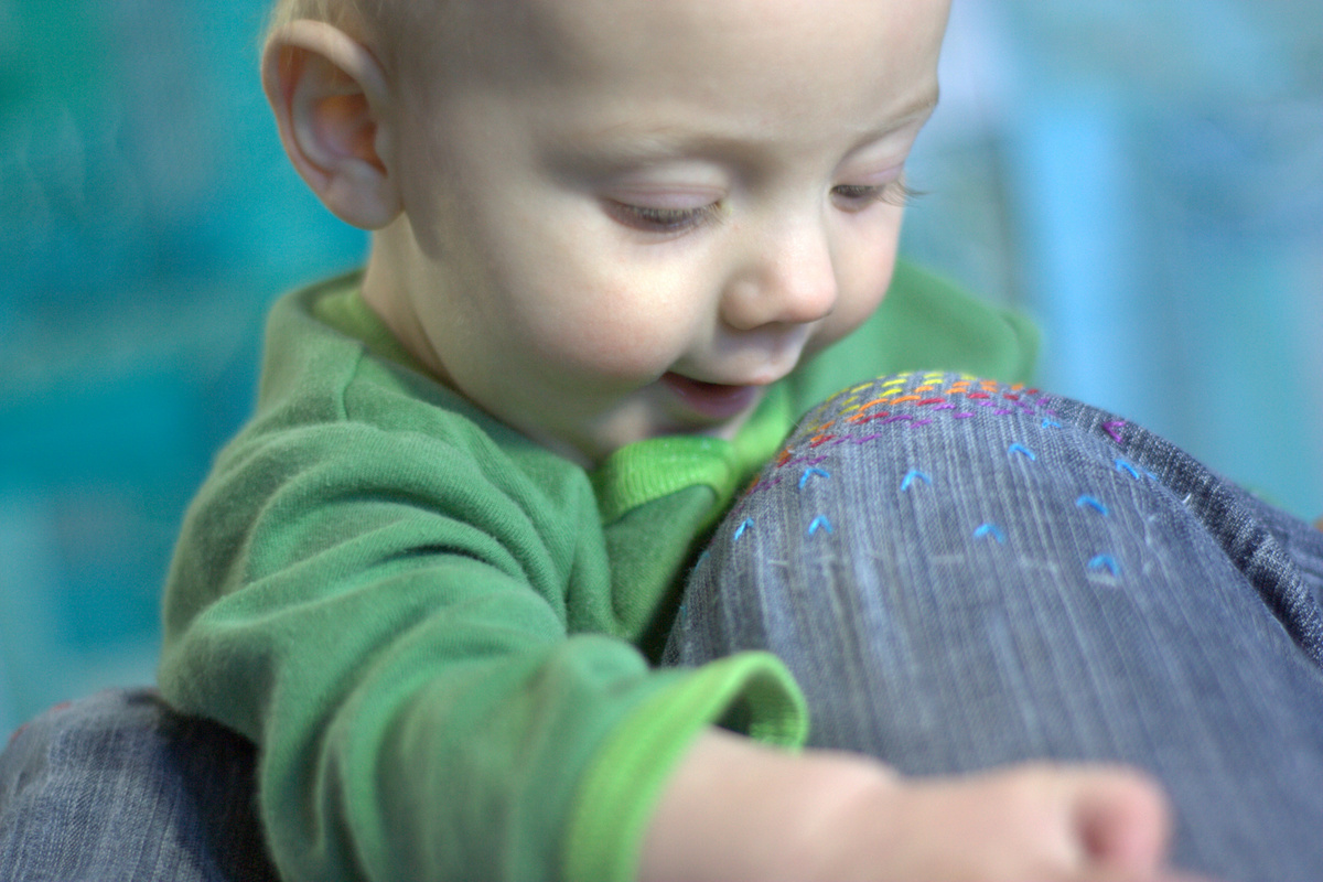 He loves to stand while holding onto my knees, and was trying to eat my colorful knees.