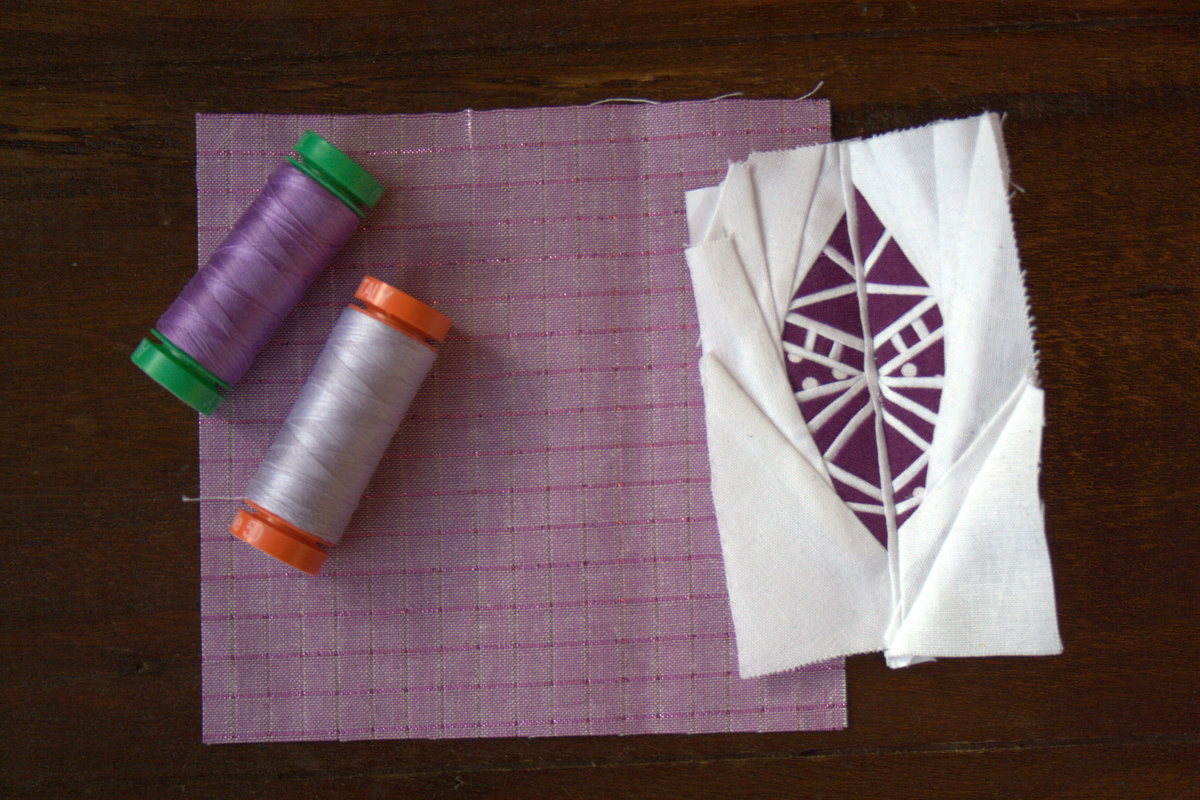 I’m leaning toward the lighter purple Aurifil for the stitching, so that it will blend in with the Loominous.