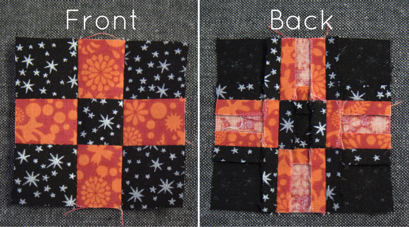 Carefully sew them together, pinning just after each seam join. Press seams open. Above shows my block, front and back. Note how nicely the pressed-open seams sit! Set your 9-patch aside.