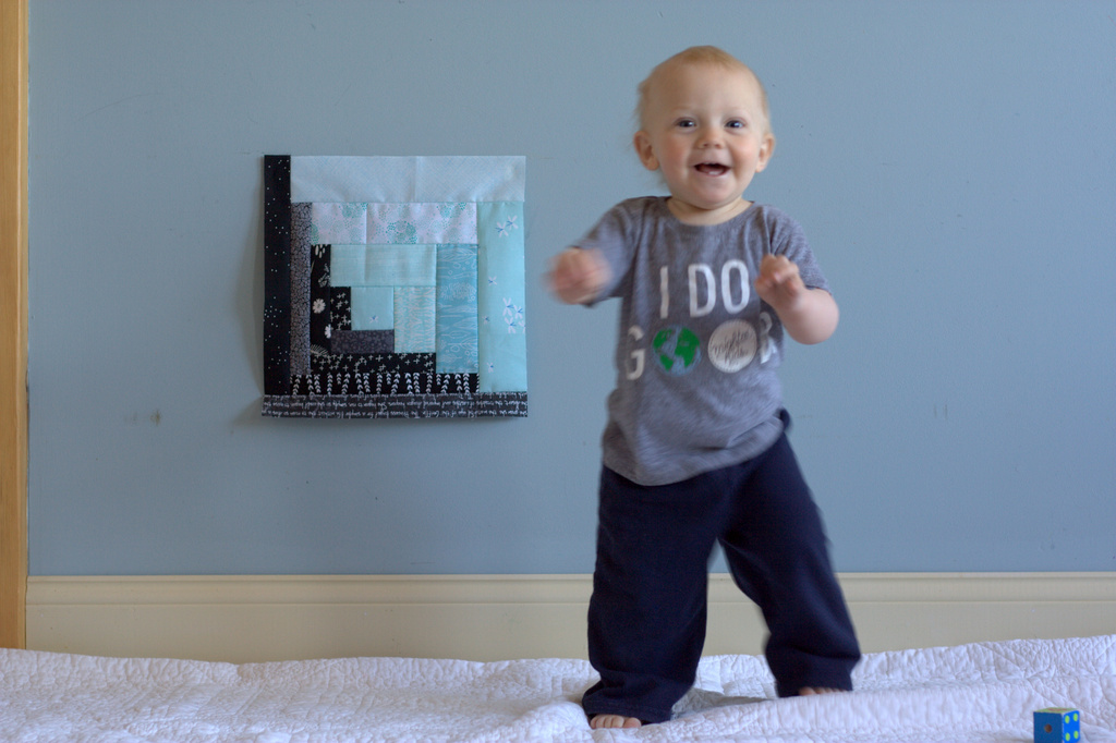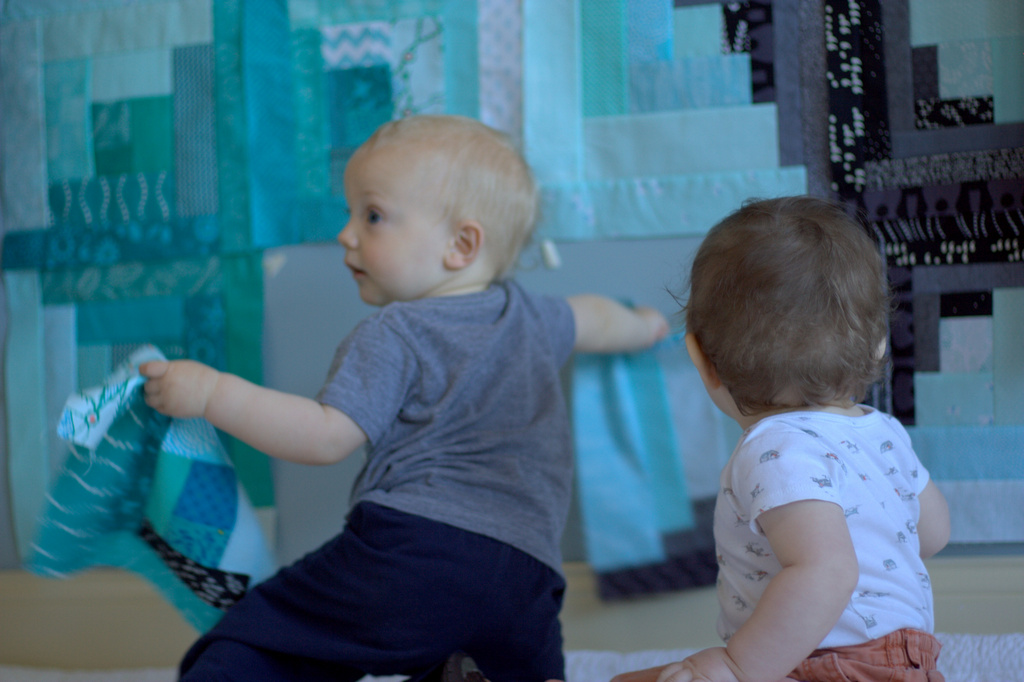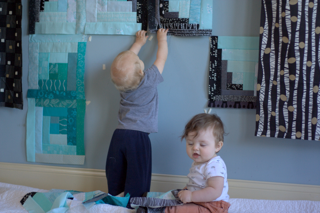 Once I gave them the go ahead, it was a quilt block grabbing, tasting, throwing free-for-all. Ronin especially enjoyed the tactile-oral quality control job. Such adorable kids.