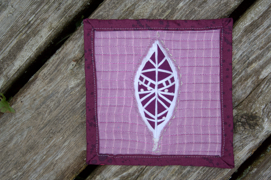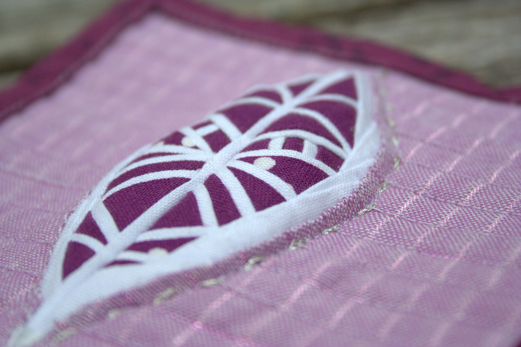 I used the backing as binding and folded over a larger portion on this mini mini quilt, since I felt it needed a stronger frame due to the visual weight of the 3-dimensional feather. Mini mini quilts certainly keep me humble, since every little stitch is visible, and the wobbles and less-than-perfect corners are part of the charm.