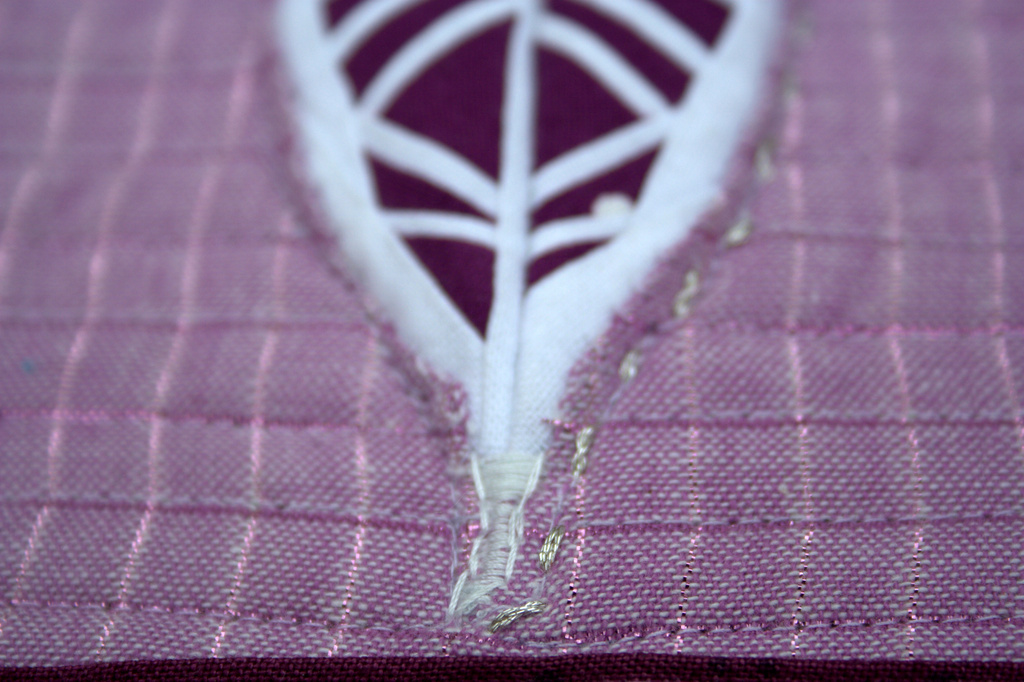 I absolutely love tiny stitching, mostly because of the giggles that reflexively bubble over while I’m piecing the ridiculously tiny pieces. This tiny feather was no different, until it came time to sew the two sides together. The seam was crazy thick; so thick, I had to hand crank my sewing machine to get the needle through it without breaking (I broke a needle trying the first time). With a seam that thick, you can guess how great my chances of pressing it flat might be–slim to none! My solution? I stuffed actual wool batt behind the feather and then quilted around it as best as I could. It’s not exactly trapunto; it’s more a stuffed feather!
