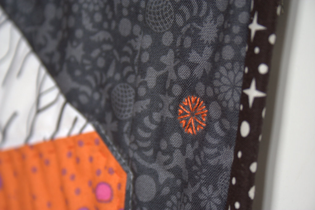 Although the mini quilt is bound and finished, I am 99.9% sure I am going to do more embroidery-quilting on the Alison Glass Endpaper outer border. I was debating whether to stick with the colors extending from each arm of the star or to mix it up in the outer border, but I think I’m going to stick with the same colors as the center. I shared more detail photos of the quilting and embroidery in my Sizzix post, so head over to see more!