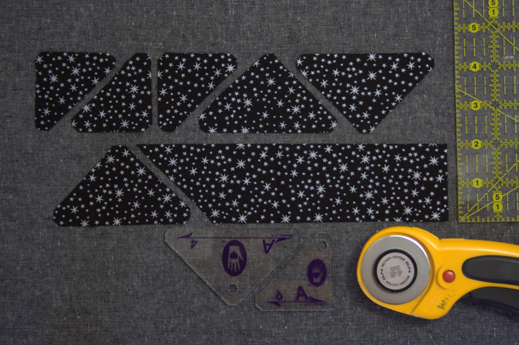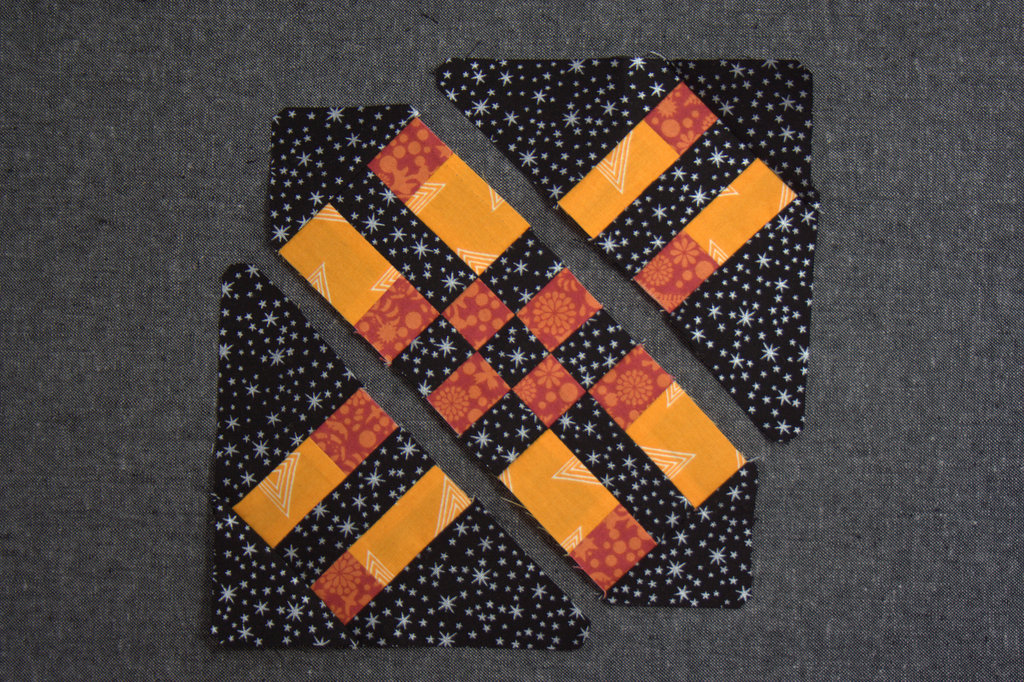 Now you have all of the components necessary for piecing Eva! Grab all of your blocks and triangles and let’s lay them out. Here is where the mirror image blocks can get easily mixed up. Take your time, cross referencing with the picture in the book or the photo above to make sure that all of your pieces are heading in the proper direction.