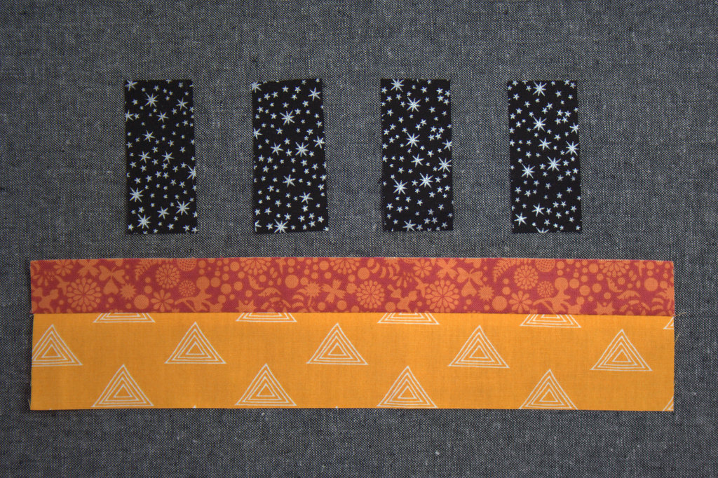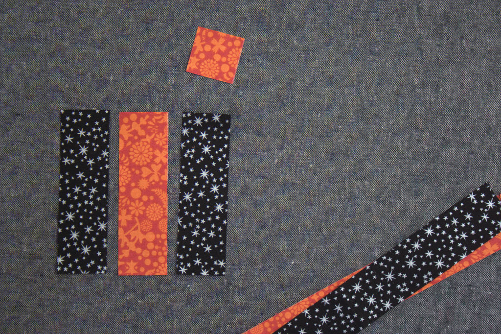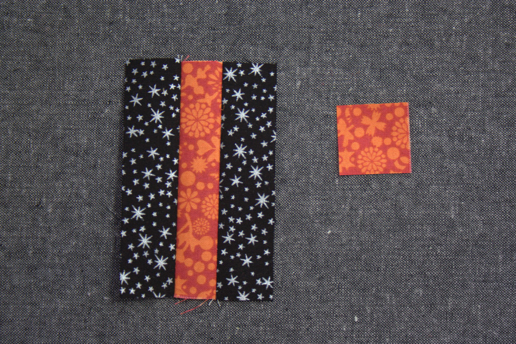 Cut one (1) 1 3/16″ x 16 1/2″ long strip of your yellow equivalent fabric (I used orange). Subcut one (1) 4″ long piece and one (1) 1 3/16″ square. Set the remainder of the strip aside.