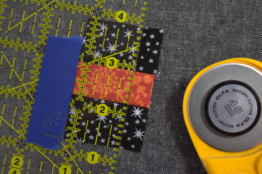 *Measurement tip: 3/16″ is halfway between 1/8″ and 1/4″. Since the 1 3/16″ measure was used so often in cutting for this block, I marked it with painter’s tape on my ruler to help avoid confusion.