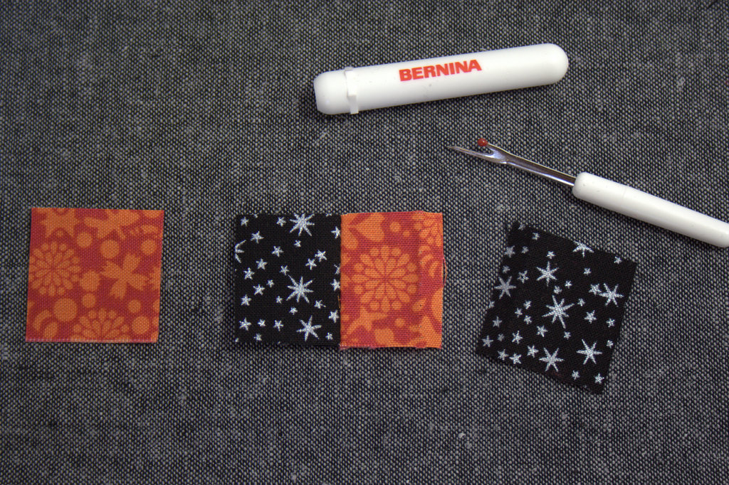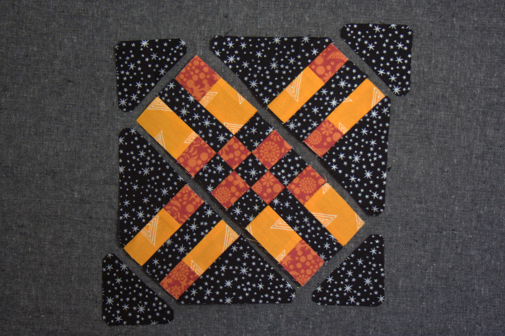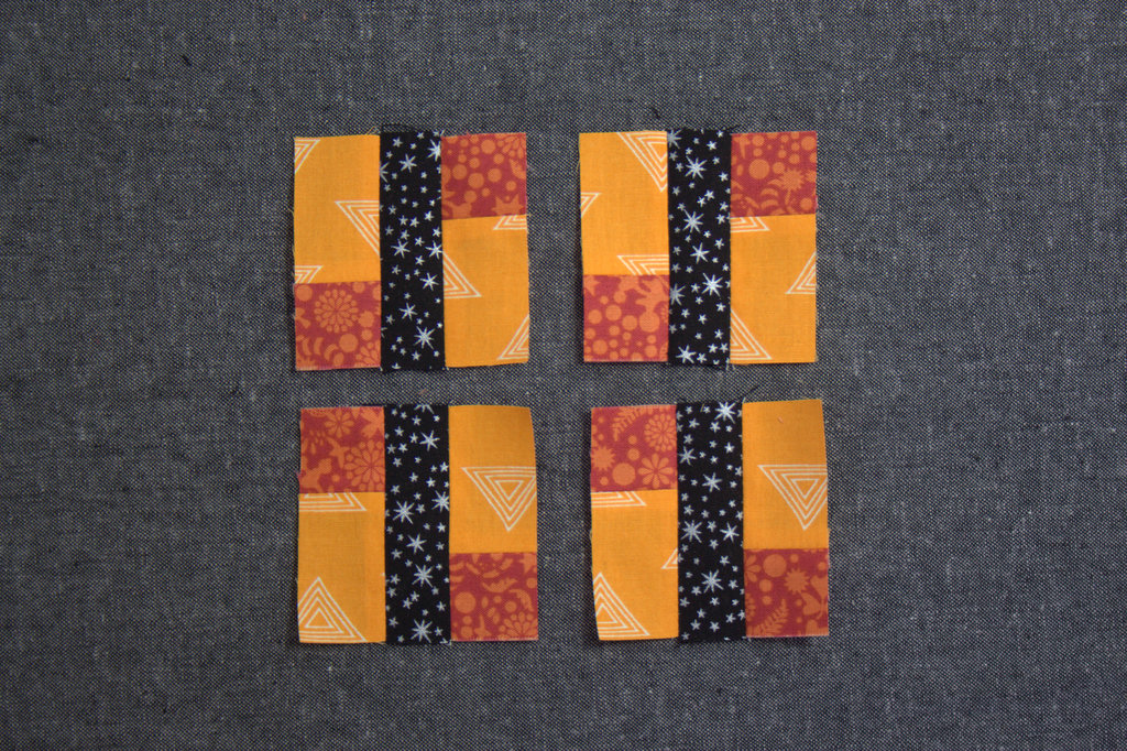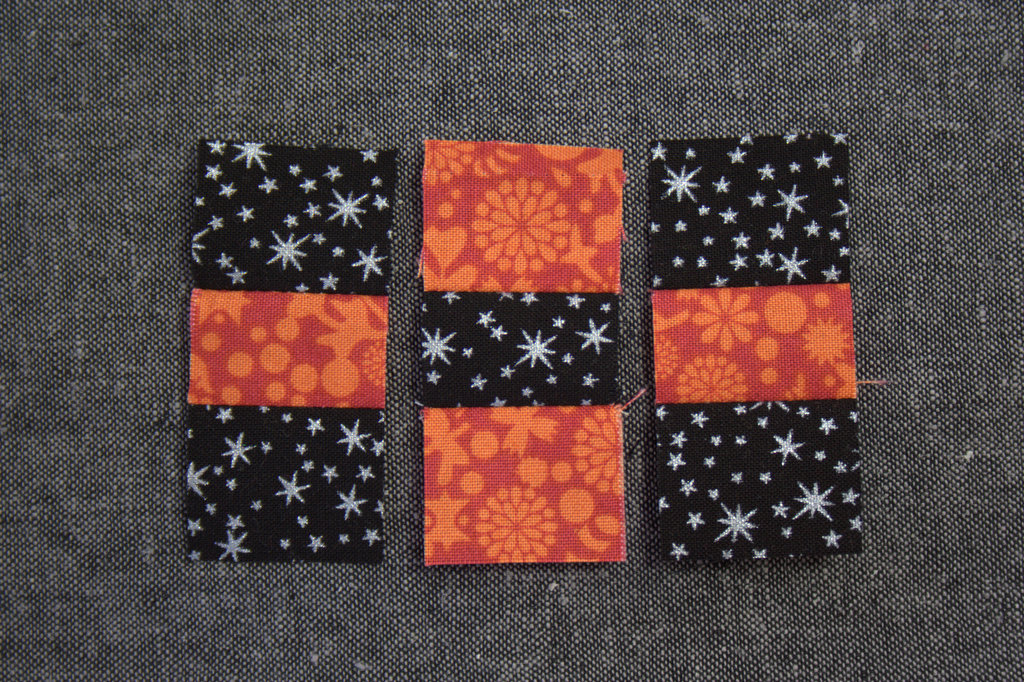 Next, carefully unsew one of the black squares. Sew the orange 1 3/16″ square to the other side to make the center strip for the 9-patch.