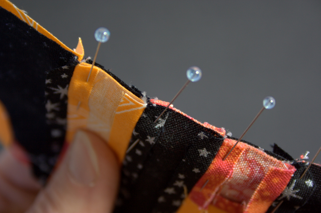 Sew black strips to orange center as shown. I prefer to press my seams open for ease of matching seams and reduction of bulk. Feel free to press open or toward the darker fabric.