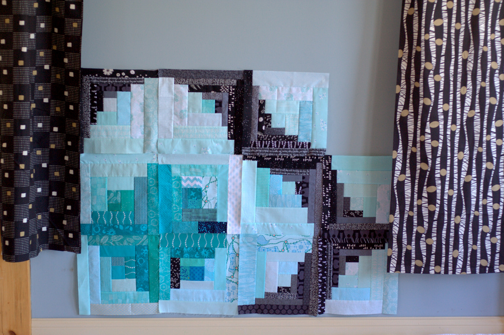 To be honest, the print that looks like birch trees was the one I thought I’d use for the backing, until seeing them hanging next to the quilt. Looking at the photo above, I’m leaning strongly toward the print on the left. I love the pops of gold in both of them, since some of the fabrics I used in the quilt blocks for the front have gold details, and the square geometric pattern reflects the log cabin structure. I can see this quilt coming together, and it’s such a fun sight!