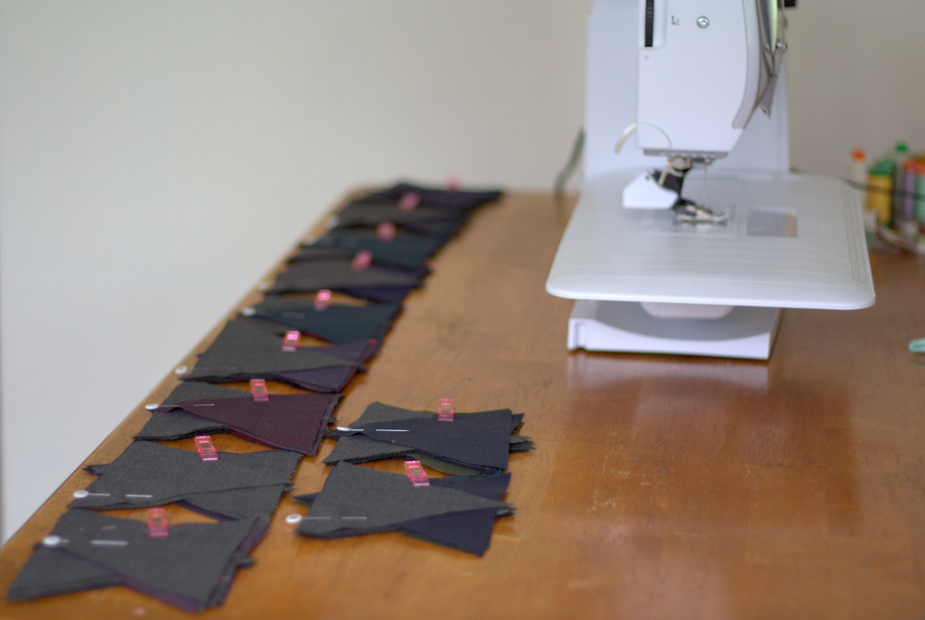 Next, add the next triangle to each row, chain sewing again. You’ll be sewing the third triangle (which is now on top of each stack) to each row. Double check the number pin on the sewn row before adding the next triangle, since you want to be sure to keep your gorgeous layout intact.