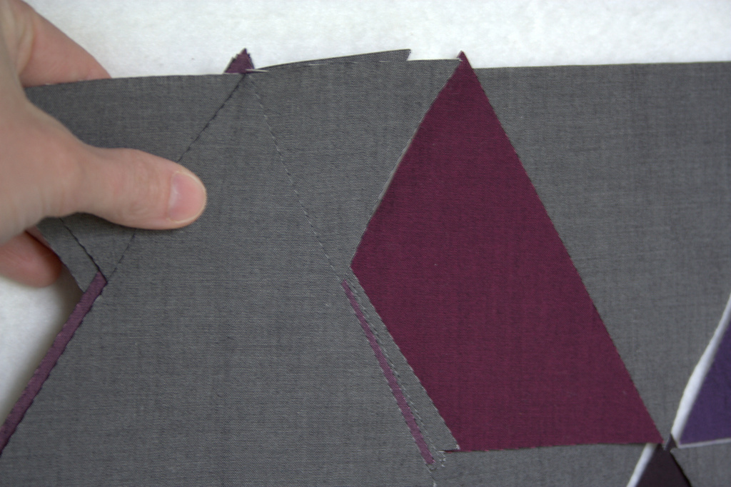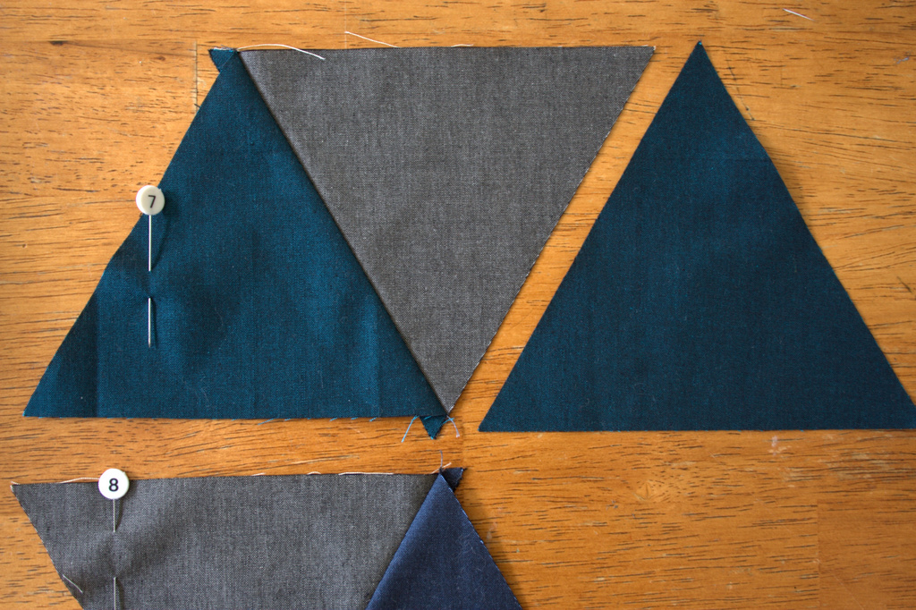 Sew all of the rows together, pressing seams up toward the grey triangles. I like to pin about 1/8″ after each point where the triangle points will be matching up, and aim to sew *right* through the center of the seam-cross to make sure you don’t cut off any points when sewing the rows together.