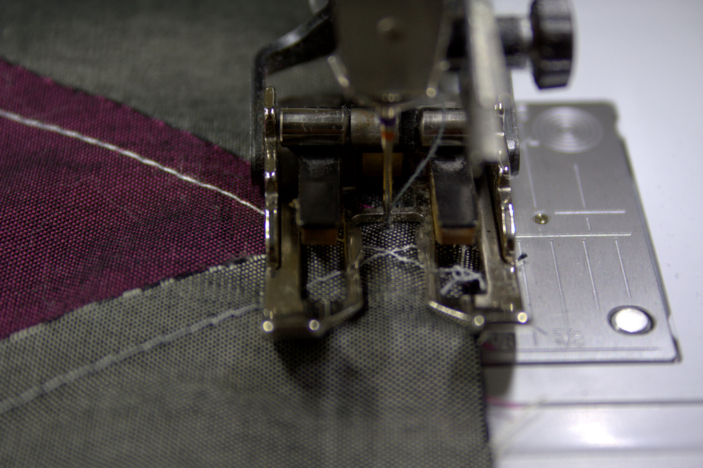 Be sure to keep the grain of fabric running top to bottom (the woven texture of the Oakshott Lipari makes this easy to do since the grain is clearly visible when the fabric is held up to the light). Once your pieces are laid out as desired, it’s time to sew them together! Chain piecing helps the process go quickly and smoothly. Here’s how to set it up.