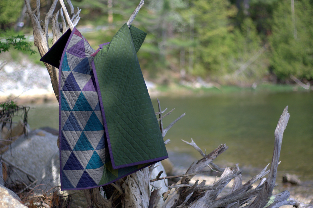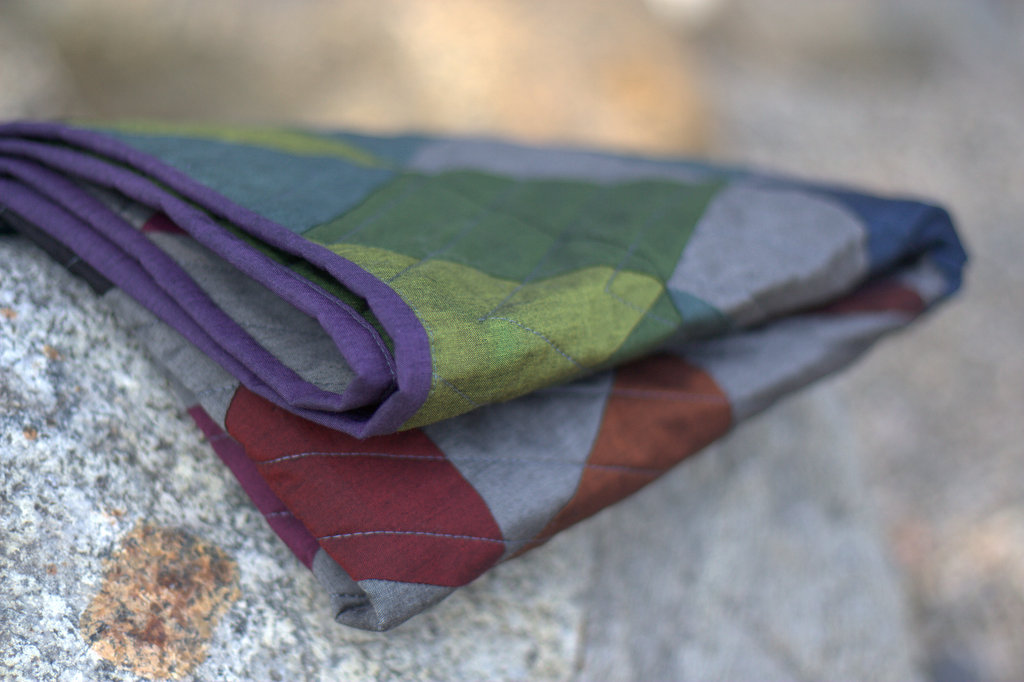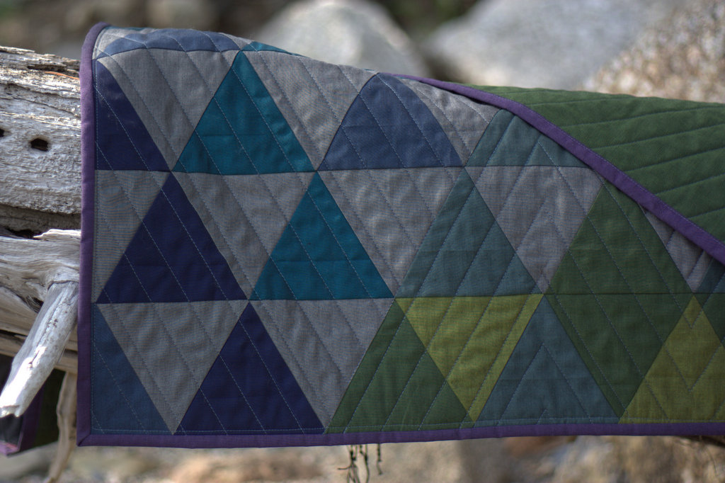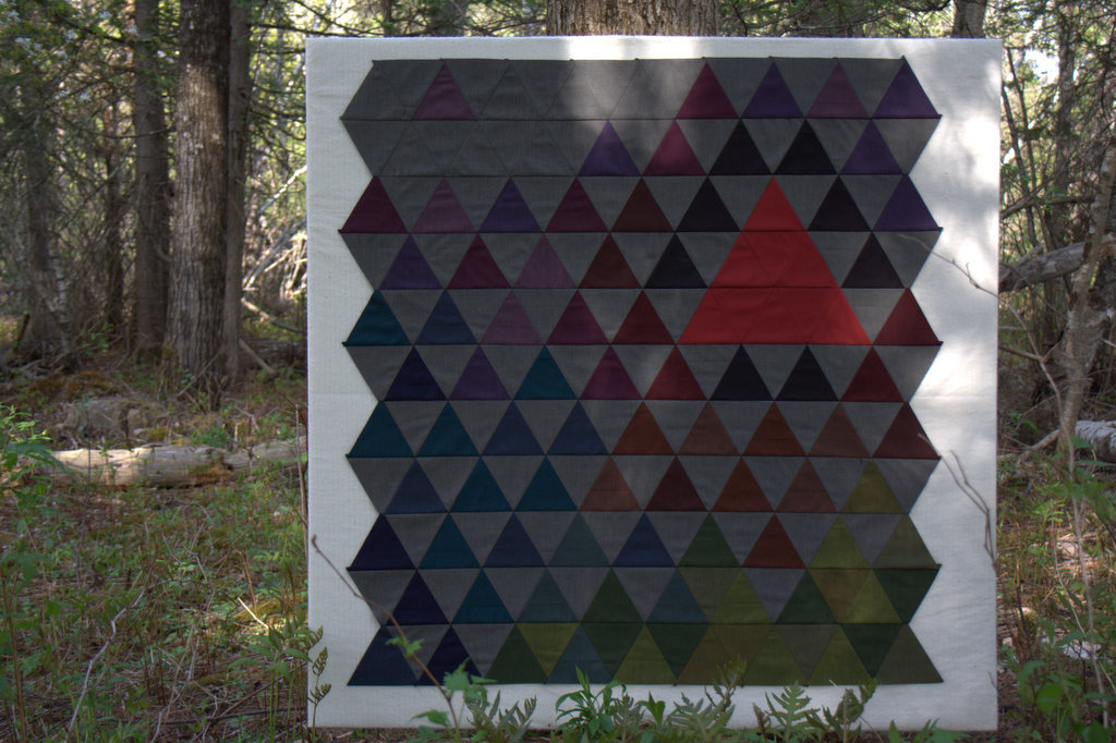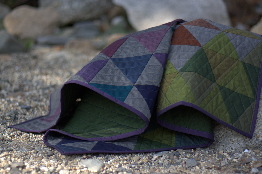 I made my Vesuvius quilt with 60 degree triangles, to elicit the sharp peaks of the mountainous volcanoes. I pulled in some Ruby Red – Toledo for the molten focal triangle, and let the Lipari steal the show. I used my Sizzix die cutting machine to speed up the cutting process. I really wanted to photograph this quilt next to a volcano, but I had to settle for some blueberry barrens and a Maine coast beach.
