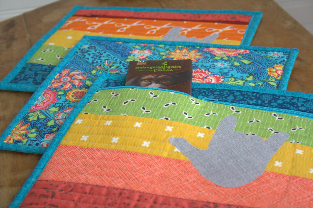 More about that “I love you”; I think the American Sign Language (ASL) sign for “I love you” is known pretty universally, but in case you’re not familiar with it, the appliqué on each pouch is a tracing of my son’s hand making the “I love you” sign. My son is hard of hearing and wears hearing aids (when we can convince him to keep them in), and so he has a communication facilitator in addition to his two amazing teachers. His communication facilitator was fantastic, signing to him all day to increase exposure and familiarity to sign, since we are all trying to learn ASL as a family, and ensuring he heard directions during the day. The entire preschool class learned some sign language throughout the year, and the three teachers worked so well together to help ALL of the children in class have the best experience possible. When Max gave the gifts to his teachers, the “I love you” appliqué of Max’s hand was met with “awww” and a few misty eyes. I think the zipper bags were a win!