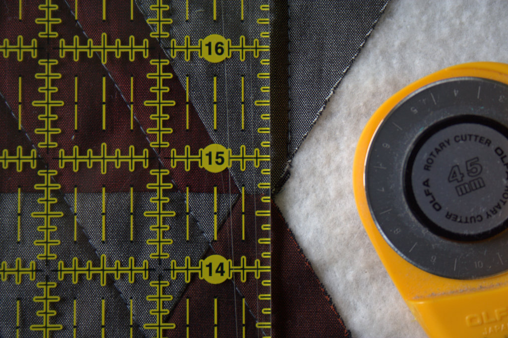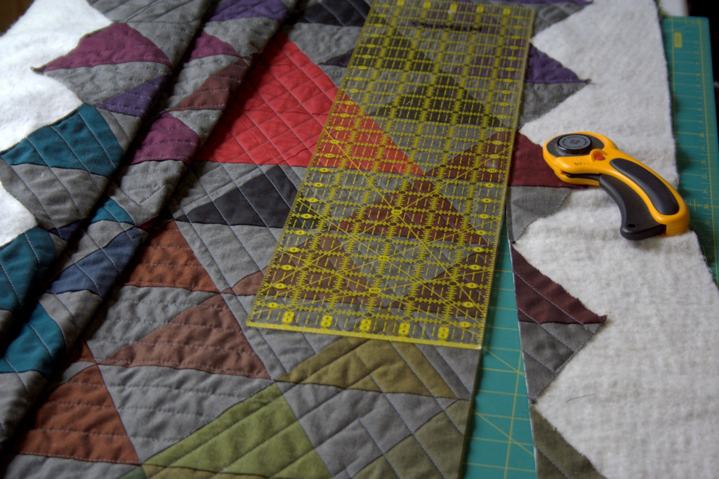 After quilting, it’s time to square up the quilt. Using a long, straight edge, trim 1/4″ away from the outer points so that you don’t lose any points when you sew on the binding. Use at least two sets of points to make sure your ruler is straight before cutting.