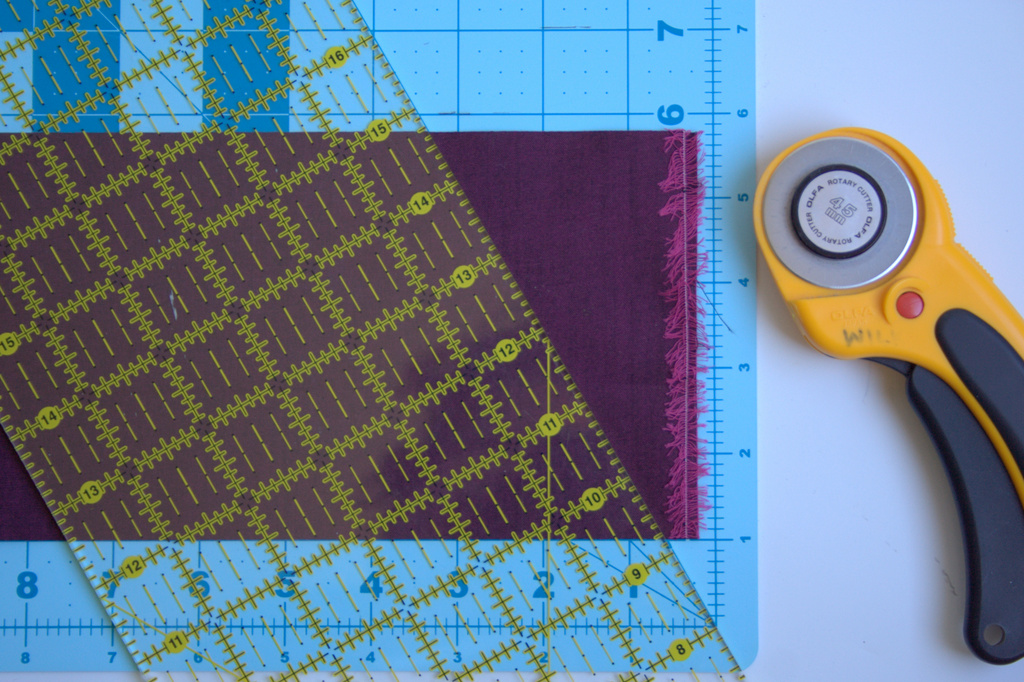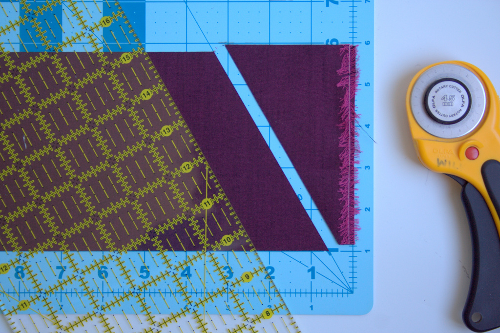 Using your rotary cutter, cut your fabric on the ruler angle.