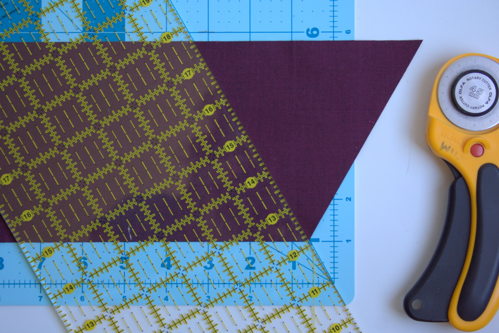 First, cut strips 4 3/4″ by width of fabric. *Note: You can leave the fabric strip folded in half or doubled up if you’re using the width of fat eighth strips, allowing you to cut two triangles at a time!